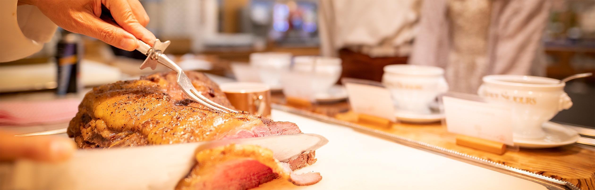 クリスマス期間は定番の「国産牛のローストビーフ」をはじめ、クリスマス限定「ローストチキン」や「クリスマス限定メニュー」をメニューに加えたクリスマススペシャルナイトブッフェを実施し、特別な夜をさらに盛りあげます。