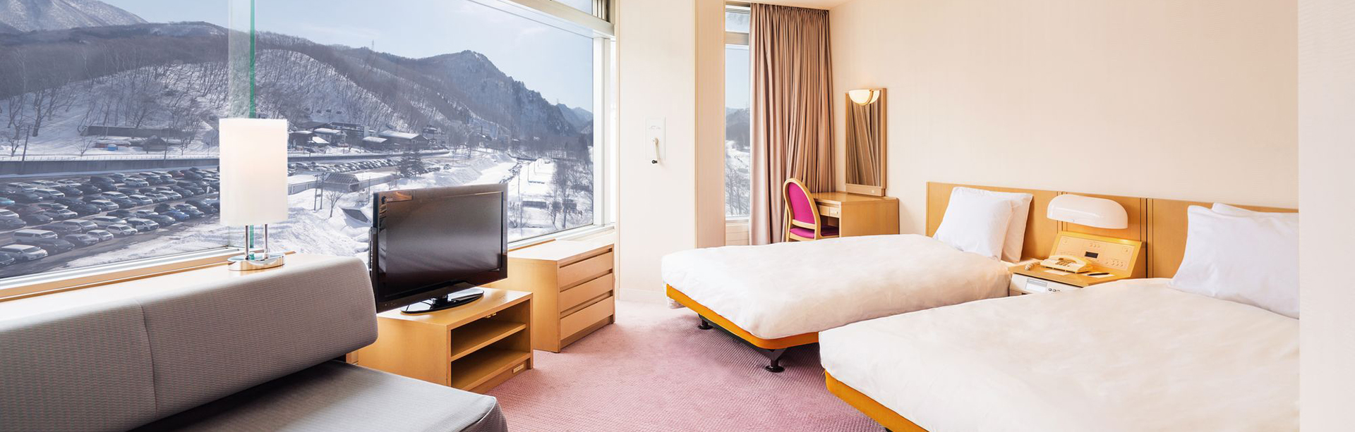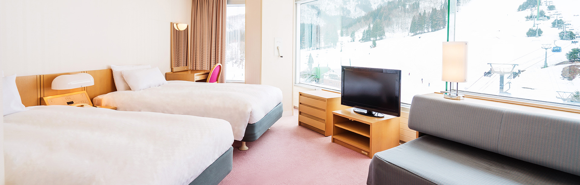 2面の窓からゲレンデが望める明るいコーナータイプのツインルームです。