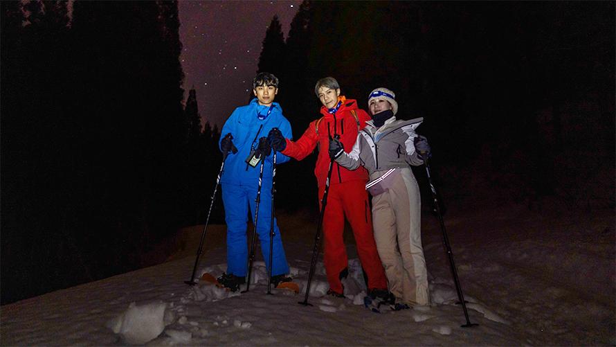 日中とは反対に、夜の静寂に包まれた森林のなかも、スノーシューツアー体験ができます。