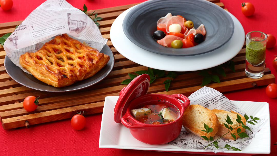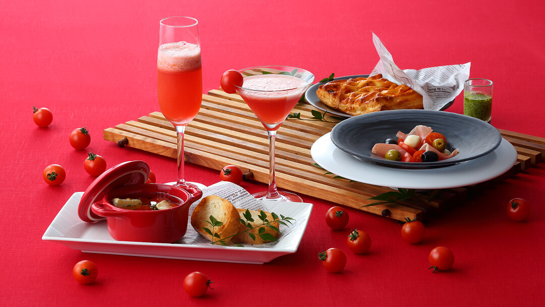 春の訪れとともに真っ赤なトマトのメニューが登場。県産のトマトを使ったドリンクとバーメニューをご提供します。グラスの中で鮮やかな赤がきらめくトマトドリンク2種と素材の持ち味を生かしたパイ、カプレーゼ、アヒージョ。旬のトマトが彩る、爽やかな春のひとときをお楽しみください。