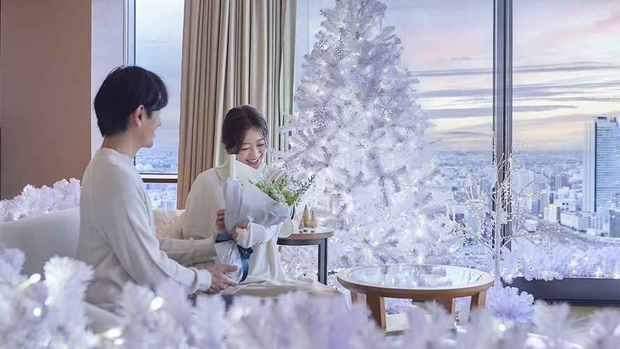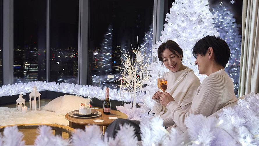 地上140mに浮かぶ天空のホテルで、白銀の世界に入り込める冬限定の非日常体験。 雪をイメージした純白の客室が、幻想的なクリスマスを演出いたします。 窓一面に広がる煌めく夜景はまさにイルミネーション。ふたりだけの展望席で光の海原と白銀の世界に包まれ、記憶に刻まれるひと時を。