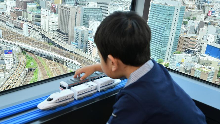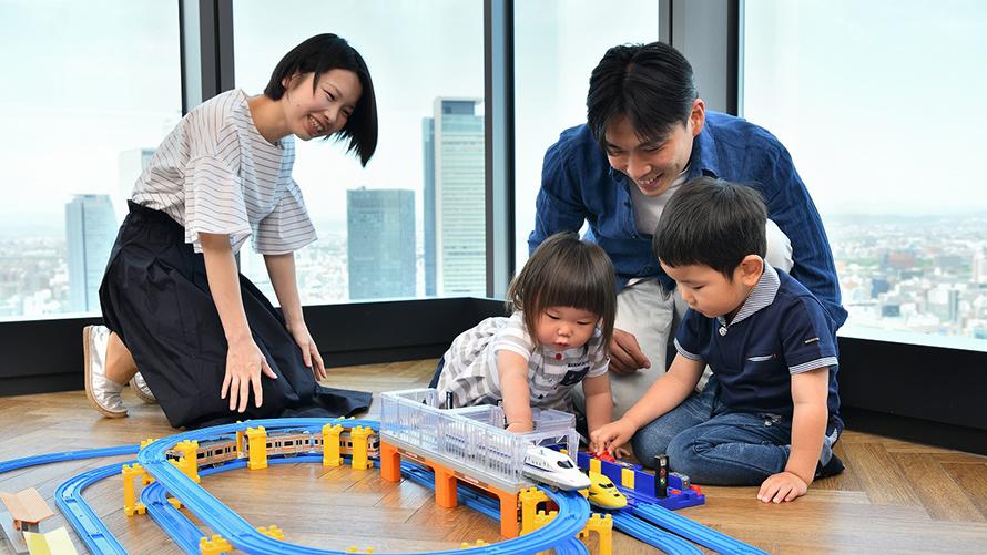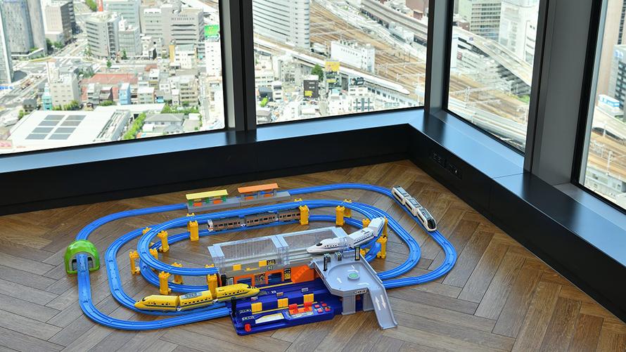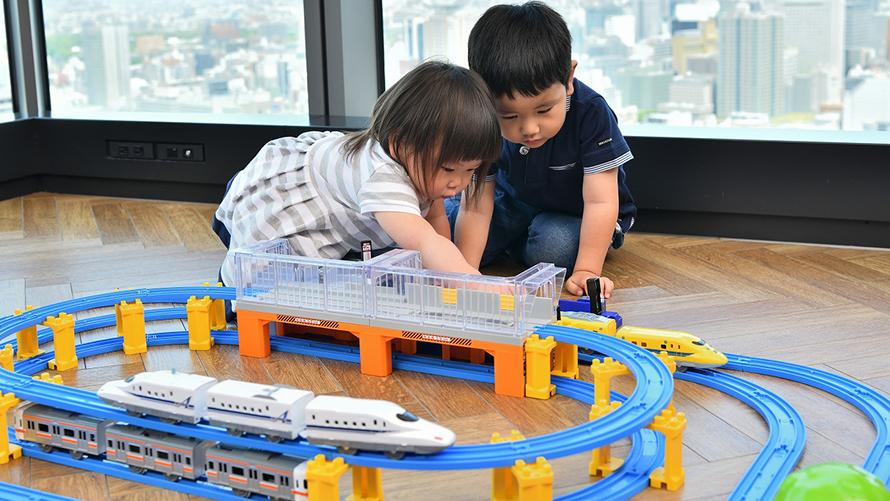 眼下に広がる鉄道ジオラマのような景色を眺めながら心ゆくまでプラレールで遊べます!