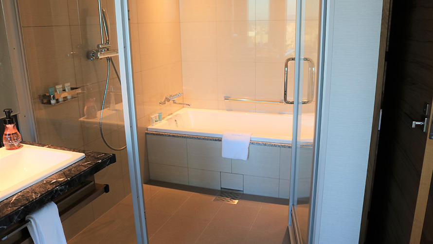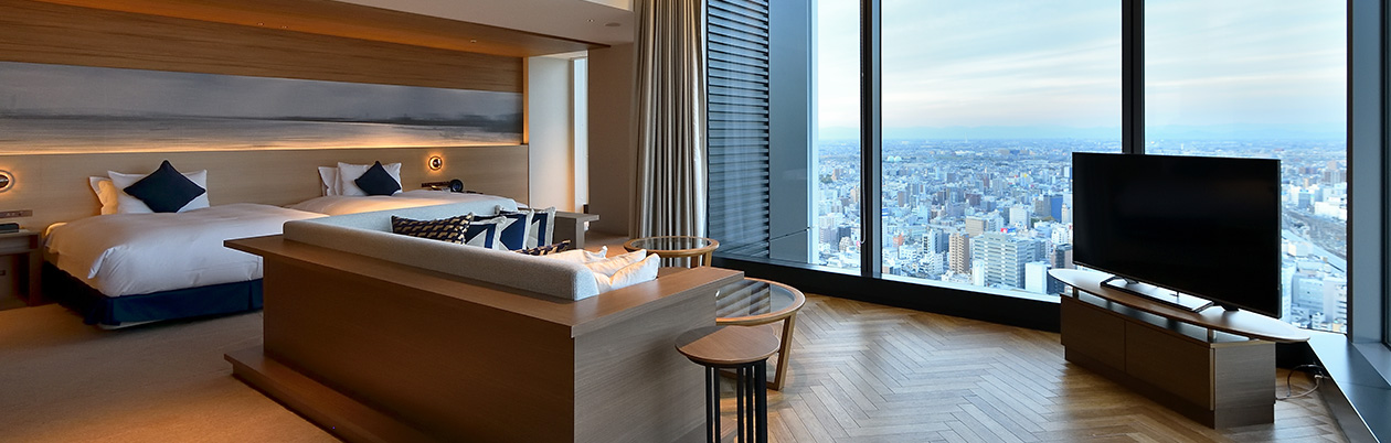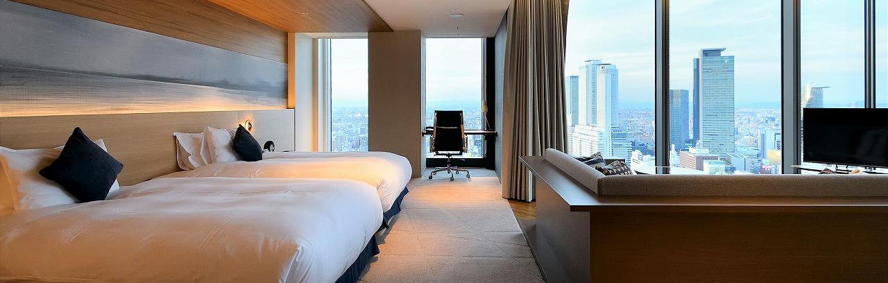 バスルームやトイレ、家具の配置などゆとりのあるデザインの客室。人気の名古屋駅方面(北側)と名古屋栄方面(東側)の眺望をお楽しみいただけます。