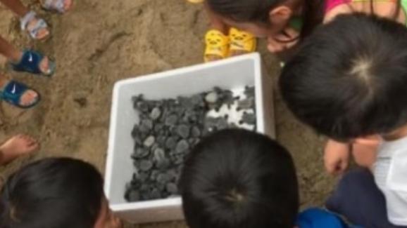 日南市の人口ふ化場でふ化した赤ちゃんを、8月12日にホテル前ビーチから放流しました。