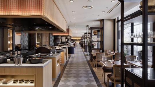 品川柘榴坂に面したライブ感あふれるブッフェ。