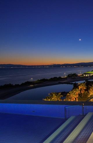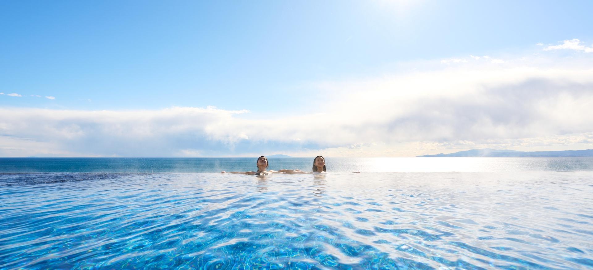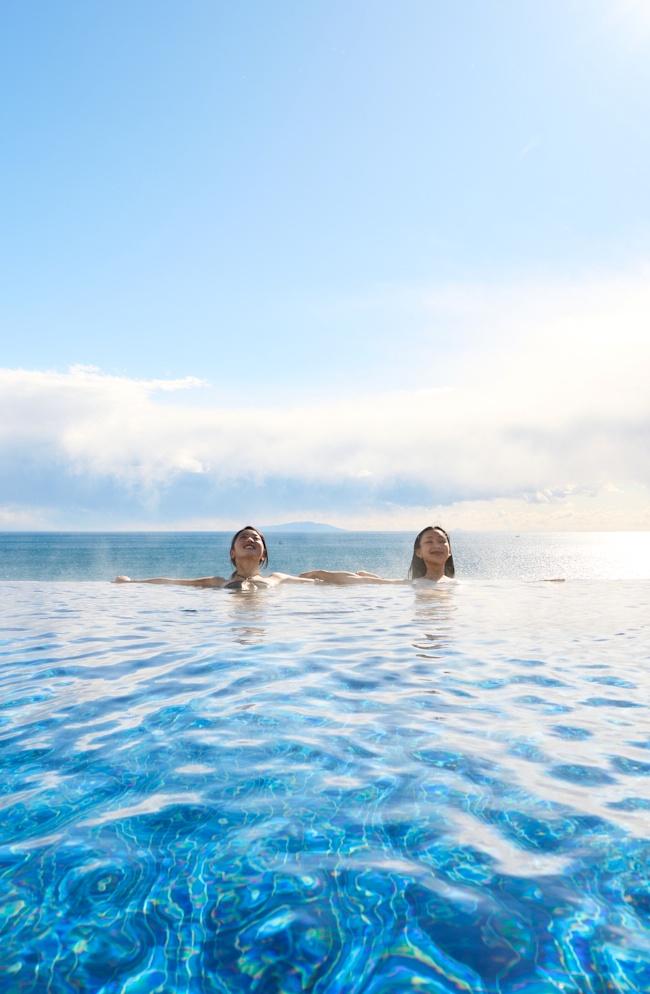 あたたかなインフィニティプール(設定温度温約38~40℃)で、サンライズの心地よさ、トワイライトの感動体験、夜の煌めき、移り変わる自然の表情に身をゆだねる特別な体験を。