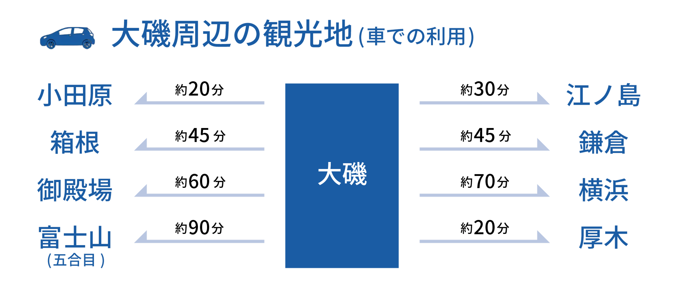 車で箱根まで約45分、江の島まで約30分の