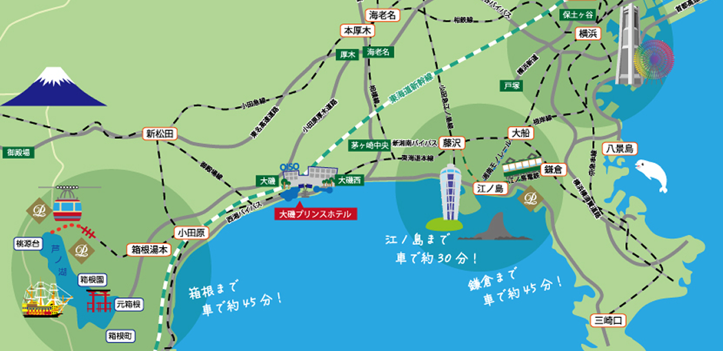 東京から約1時間という近さで、潮の香りと明るい陽ざしにつつまれた、湘南のシーサイドホテル「大磯プリンスホテル」は、数多くの文化遺跡や観光資源に恵まれている町「大磯町」に位置し、1953年(昭和28年)8月に洋室12室の「大磯ホテル」としてはじまりました。