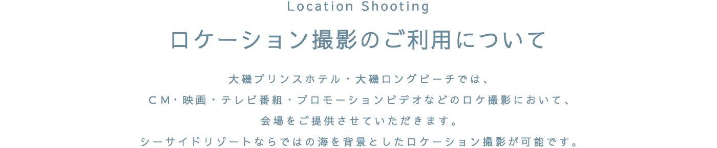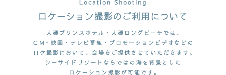 大磯プリンスホテル・大磯ロングビーチでは、CM・映画・テレビ番組・プロモーションビデオなどのロケ撮影において、会場をご提供させていただきます。シーサイドリゾートならではの海を背景としたロケーション撮影が可能です。