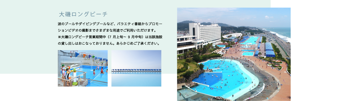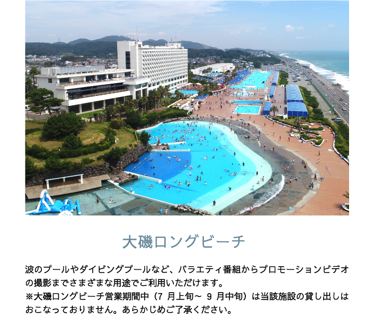 波のプールやダイビングプールなど、バラエティ番組からプロモーションビデオの撮影までさまざまな用途でご利用いただけます。※大磯ロングビーチ営業期間中(7月上旬~9月中旬)は当該施設の貸し出しはおこなっておりません。あらかじめご了承ください。