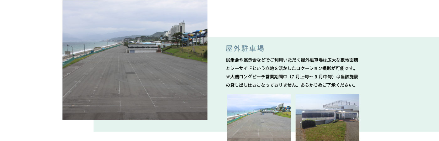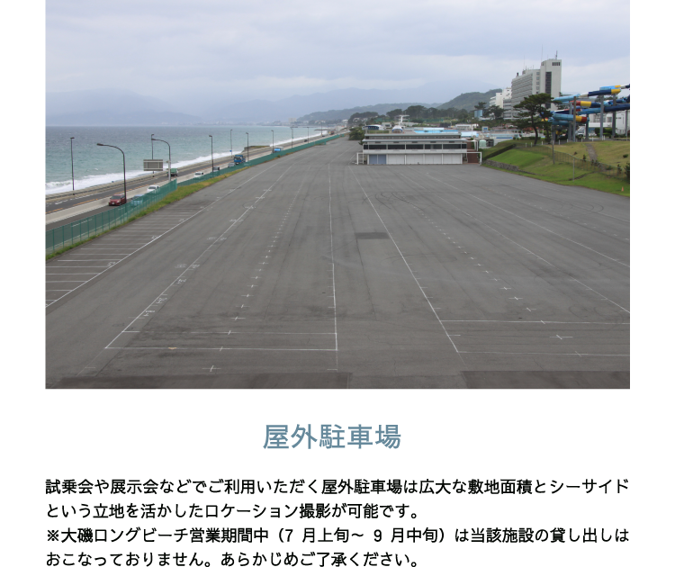 試乗会や展示会などでご利用いただく屋外駐車場は広大な敷地面積とシーサイドという立地を活かしたロケーション撮影が可能です。※大磯ロングビーチ営業期間中(7月上旬~9月中旬)は当該施設の貸し出しはおこなっておりません。あらかじめご了承ください。