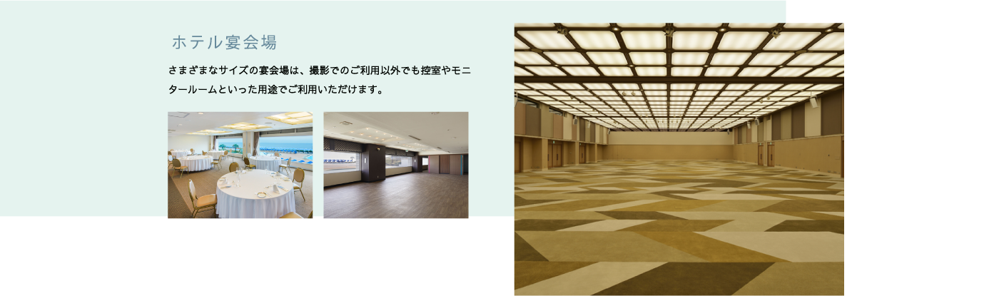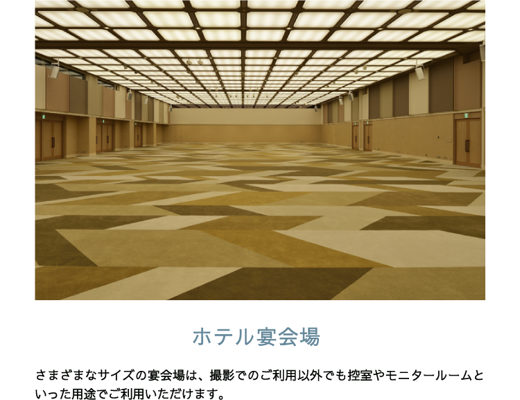 さまざまなサイズの宴会場は、撮影でのご利用以外でも控室やモニタールームといった用途でご利用いただけます。