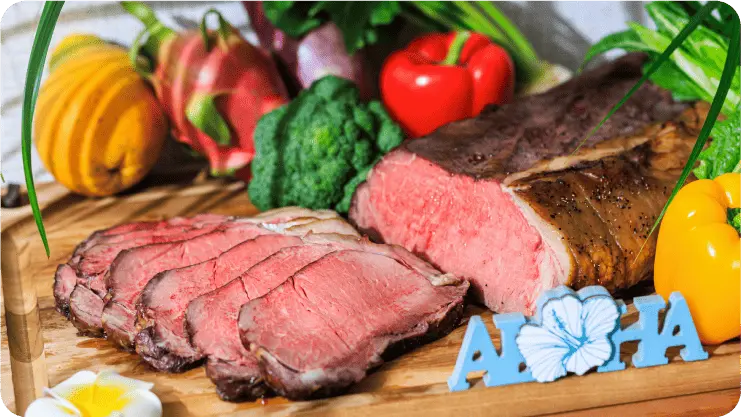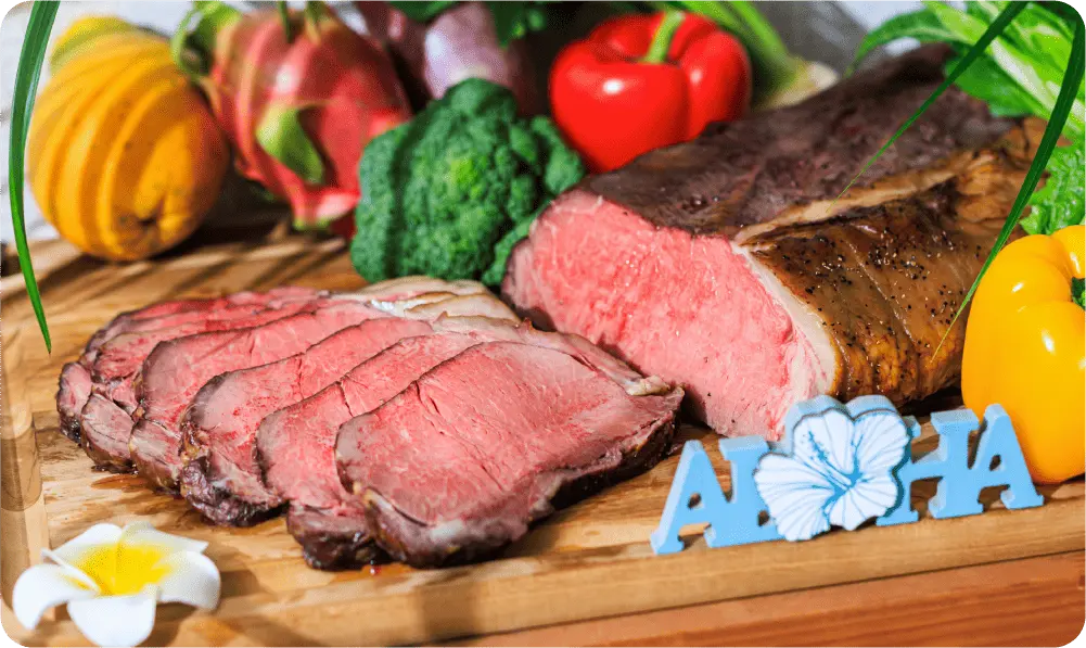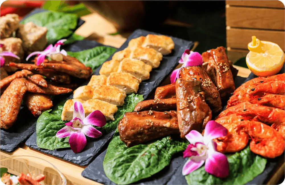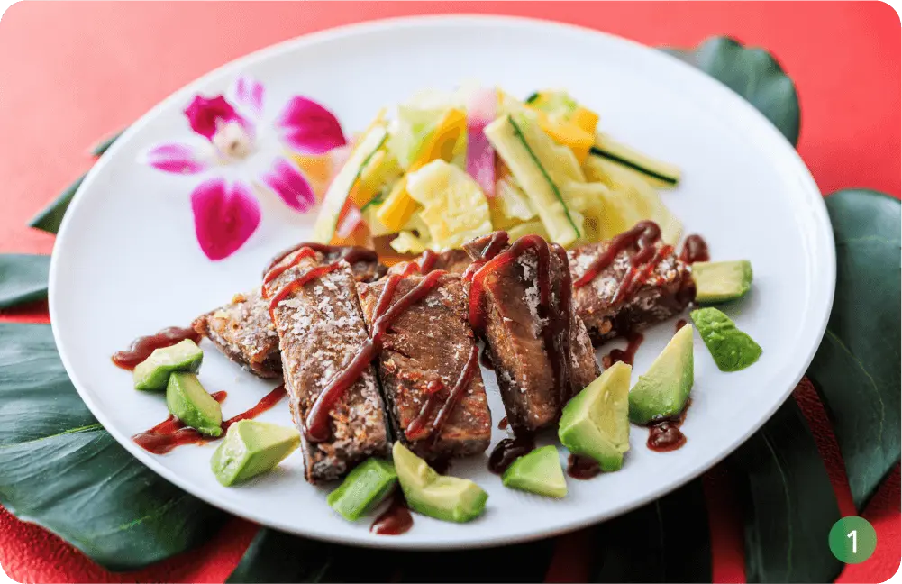 アヒポキやガーリックシュリンプなどのハワイアンメニューをはじめ、豪快な牛肉トマホークステーキなどシェフのパフォーマンス料理をご用意。お食事とともに魅惑のフラショーもお楽しみいただけます。
