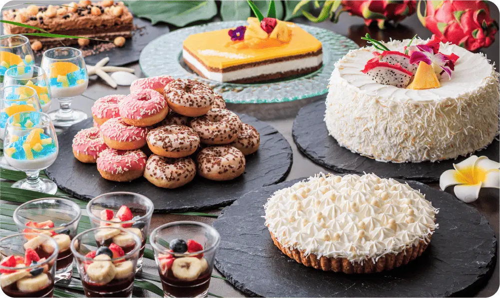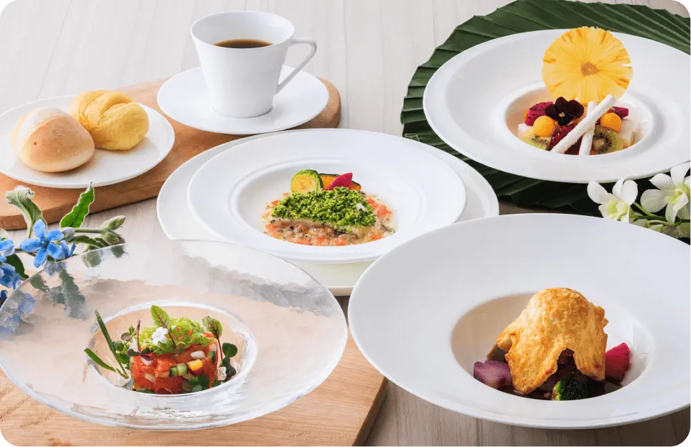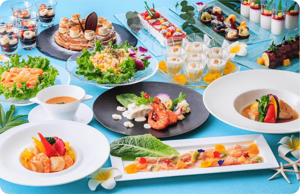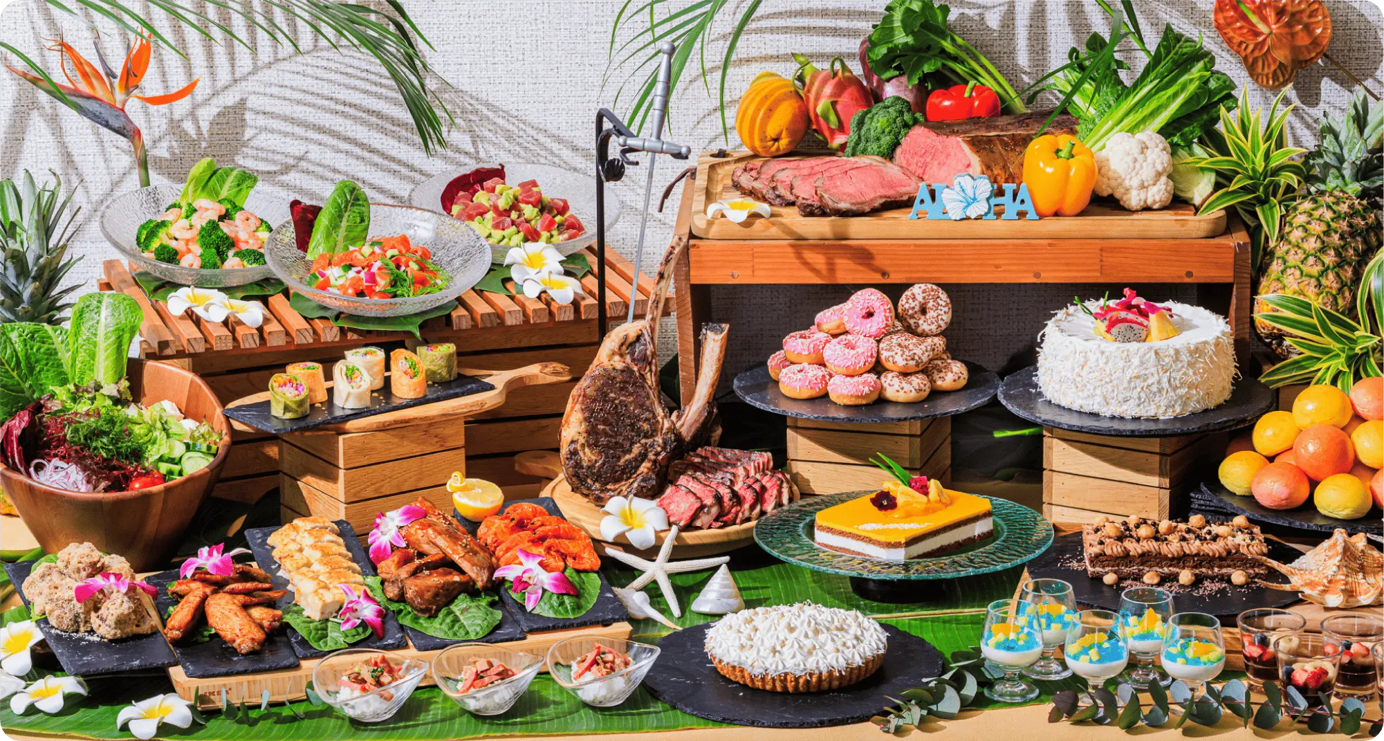 オードブルにはハワイ伝統料理の「カルアポーク」や「マグロのポケ」、デザートには「ココナッツパンナコッタ」などのハワイアンメニューが並び、お好みのメイン料理をお選びいただけるセミブッフェ。開放的なダイニングで、ハワイ気分をお楽しみください。