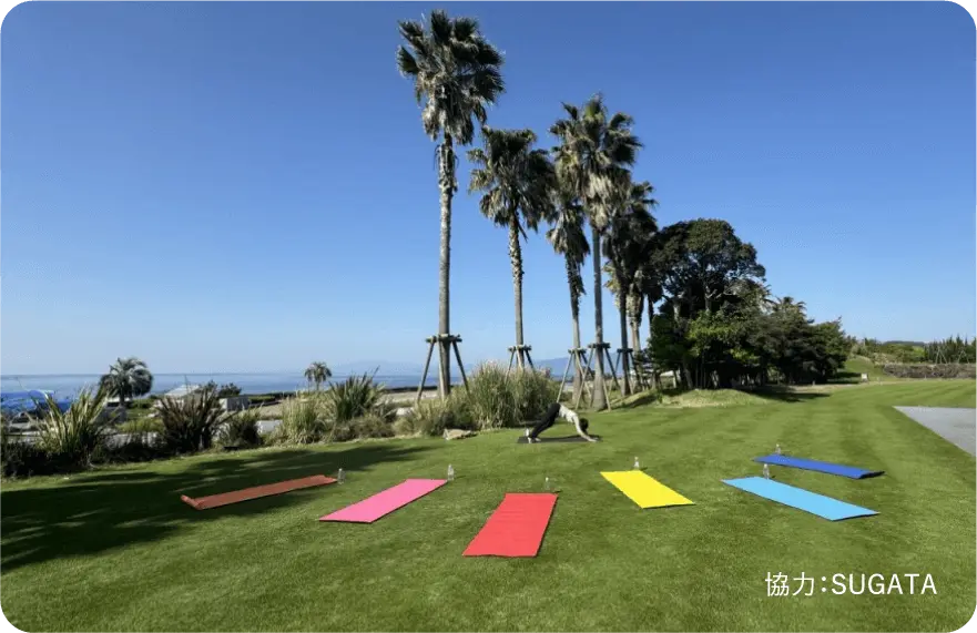 芝生の柔らかな感触を感じつつ、YOGA体験ができます。