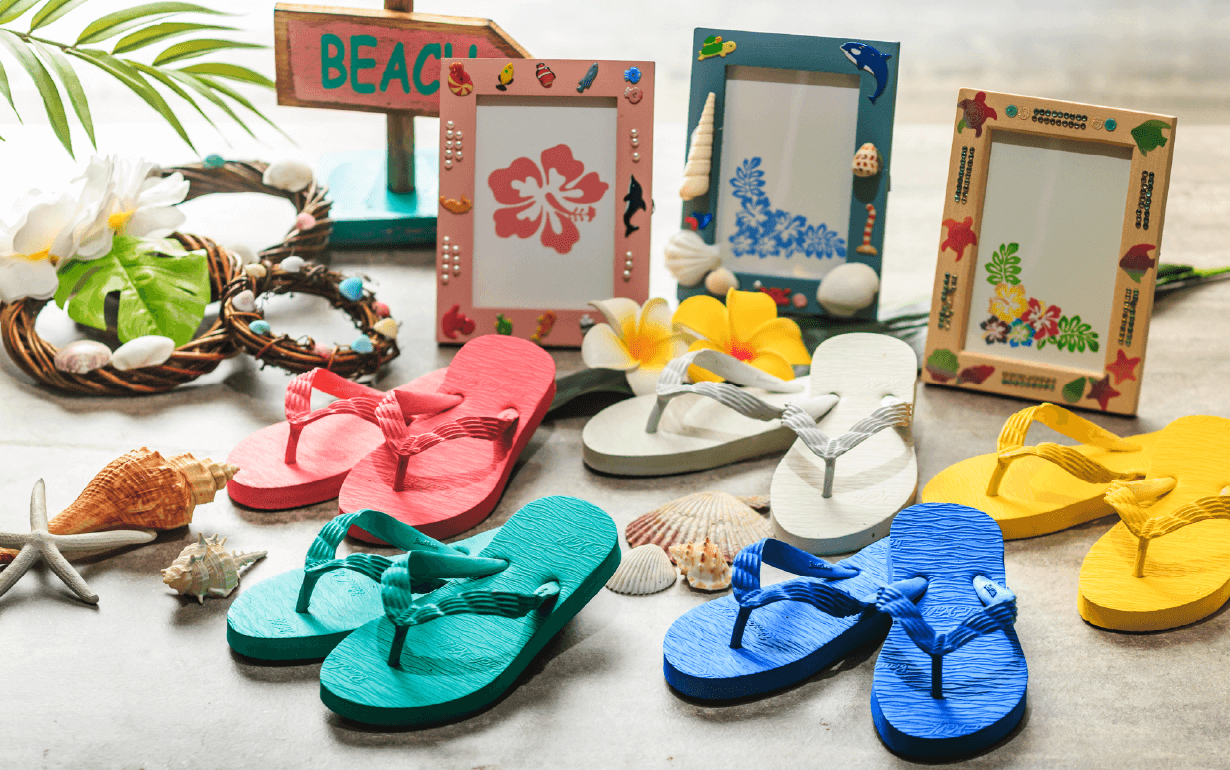 ソールと鼻緒それぞれをお好きなカラーの組合せで作るビーチサンダル作りと、貝殻やシールを貼ったオリジナルのフォトフレーム作りをお楽しみいただけます。