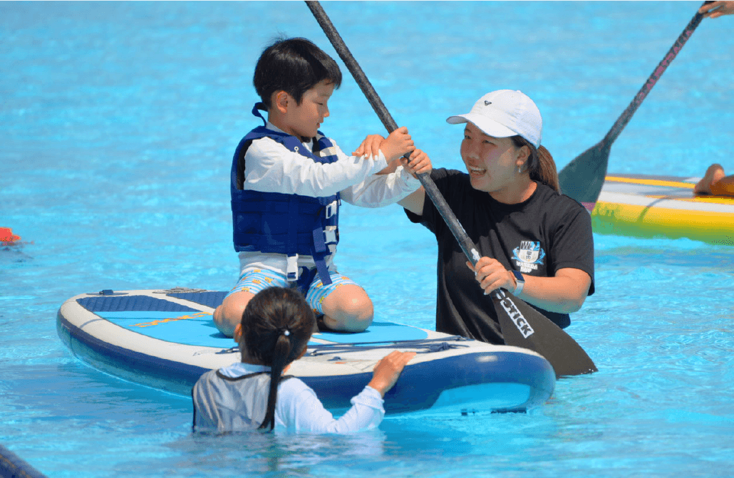 親子で参加できるSUP体験教室やSUPヨガを楽しめます。プールでのSUPは初心者でも安心。