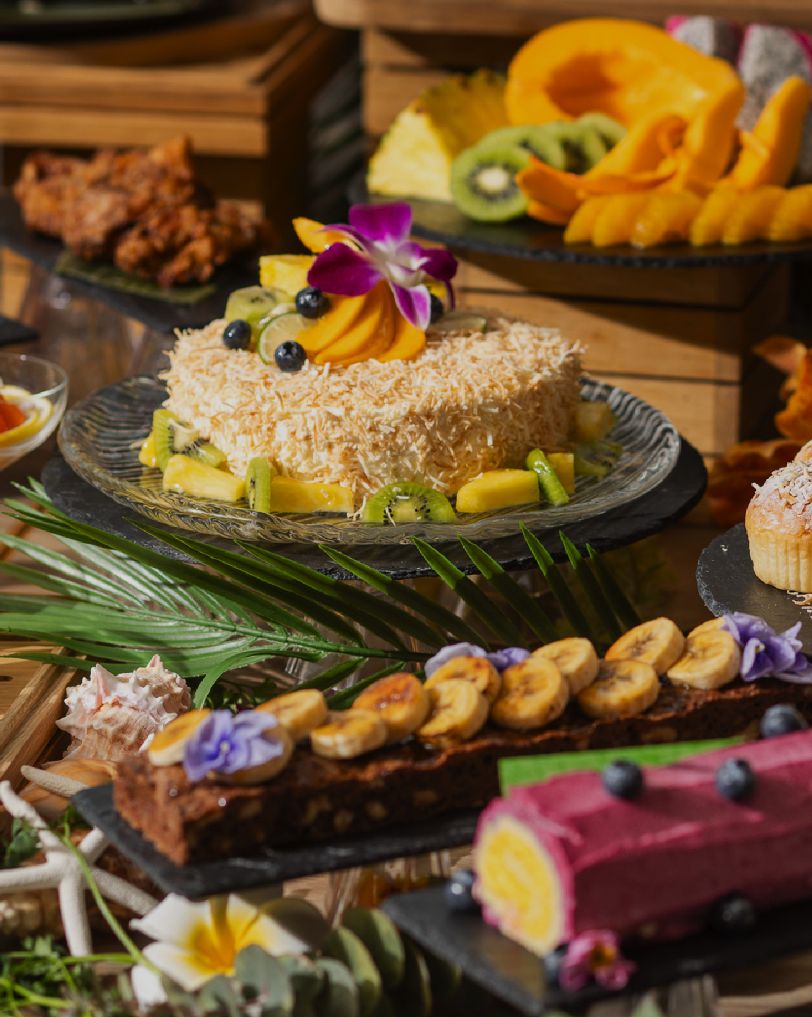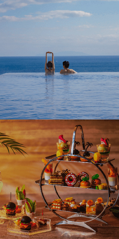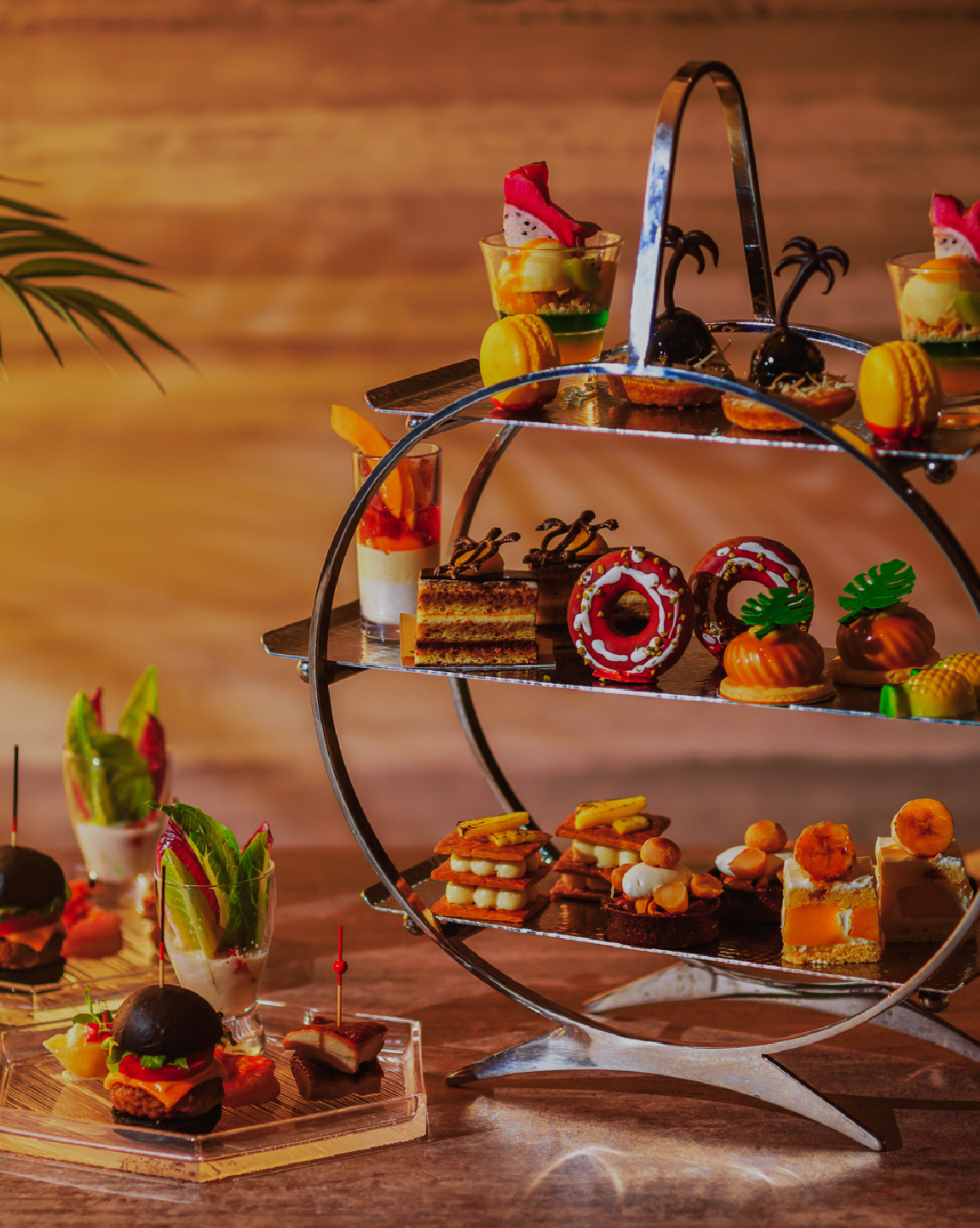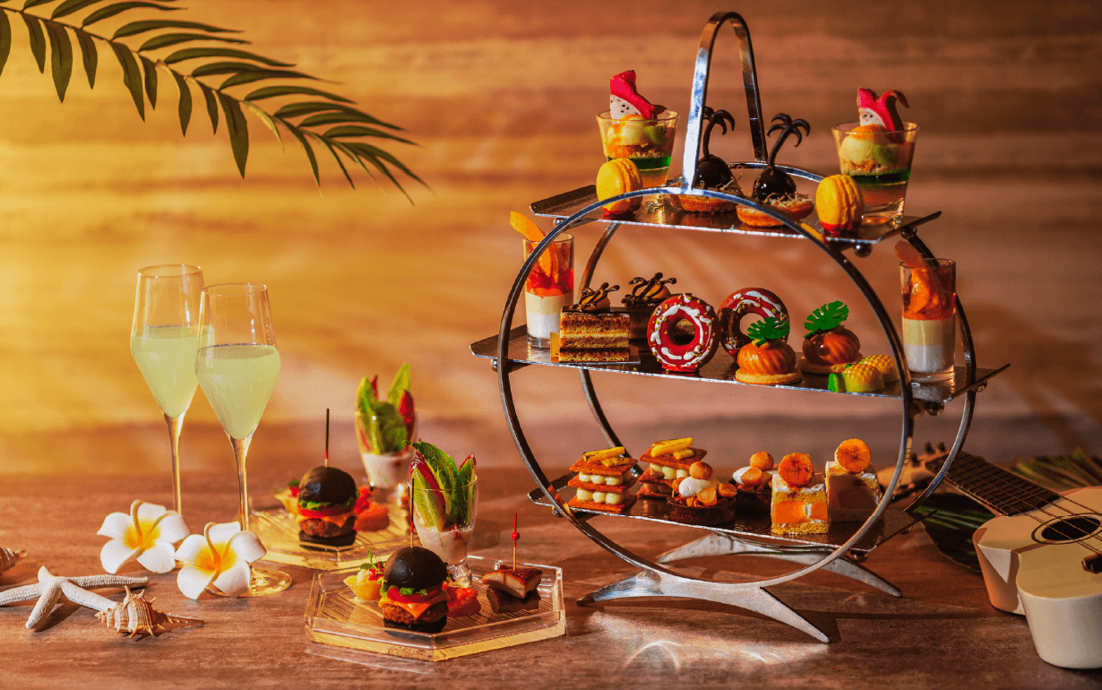 トロピカルなハワイアンアフタヌーンティーをご用意。海とヤシの木を眺めながら、ハワイでの午後のひとときのような時間をお過ごしください。