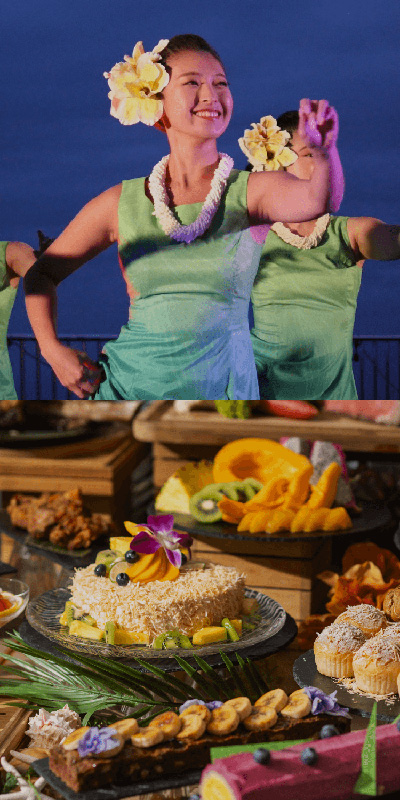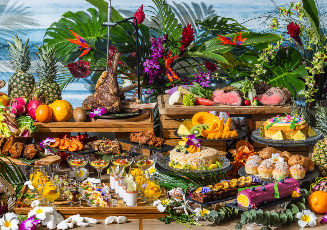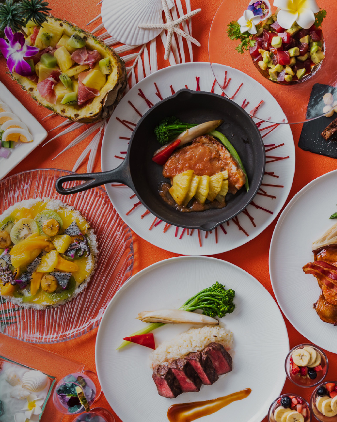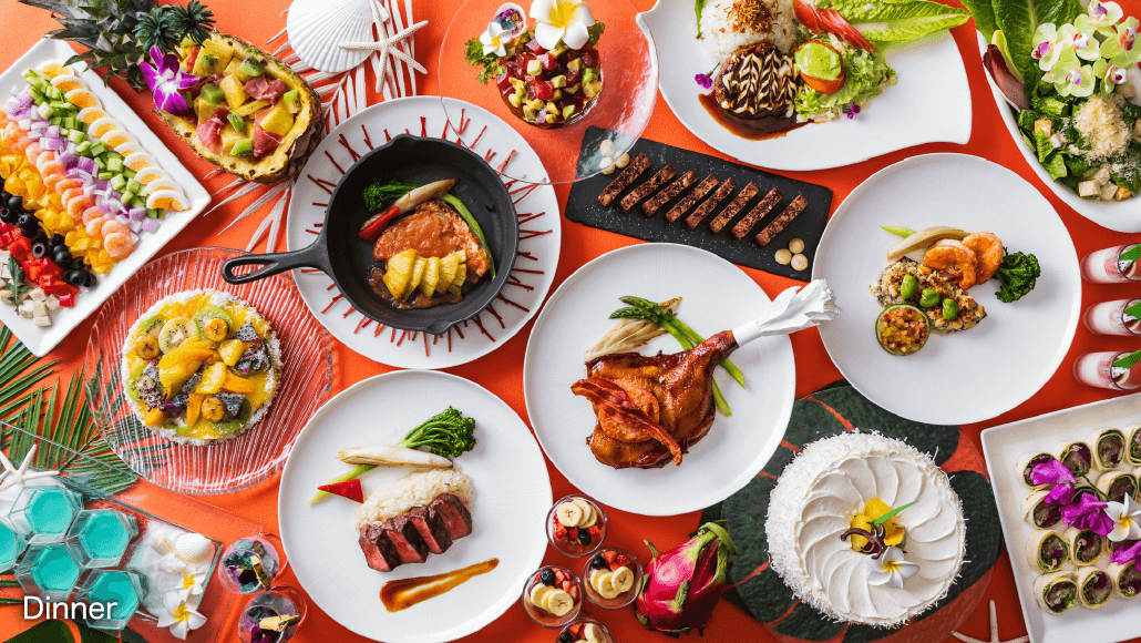 豪快なトマホークステーキ、ローストビーフなど、シェフたちのパフォーマンスメニューで魅了する「和・洋・中」のディナーブッフェが、見た目も華やかなハワイアンメニューになって登場。お食事とともにフラダンスショーもお楽しみいただけます。