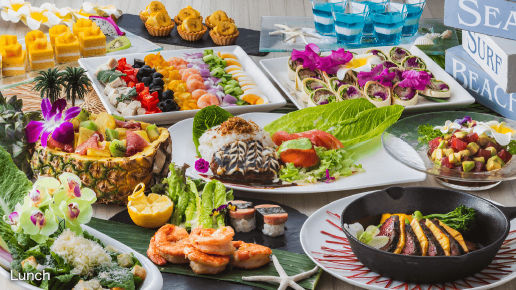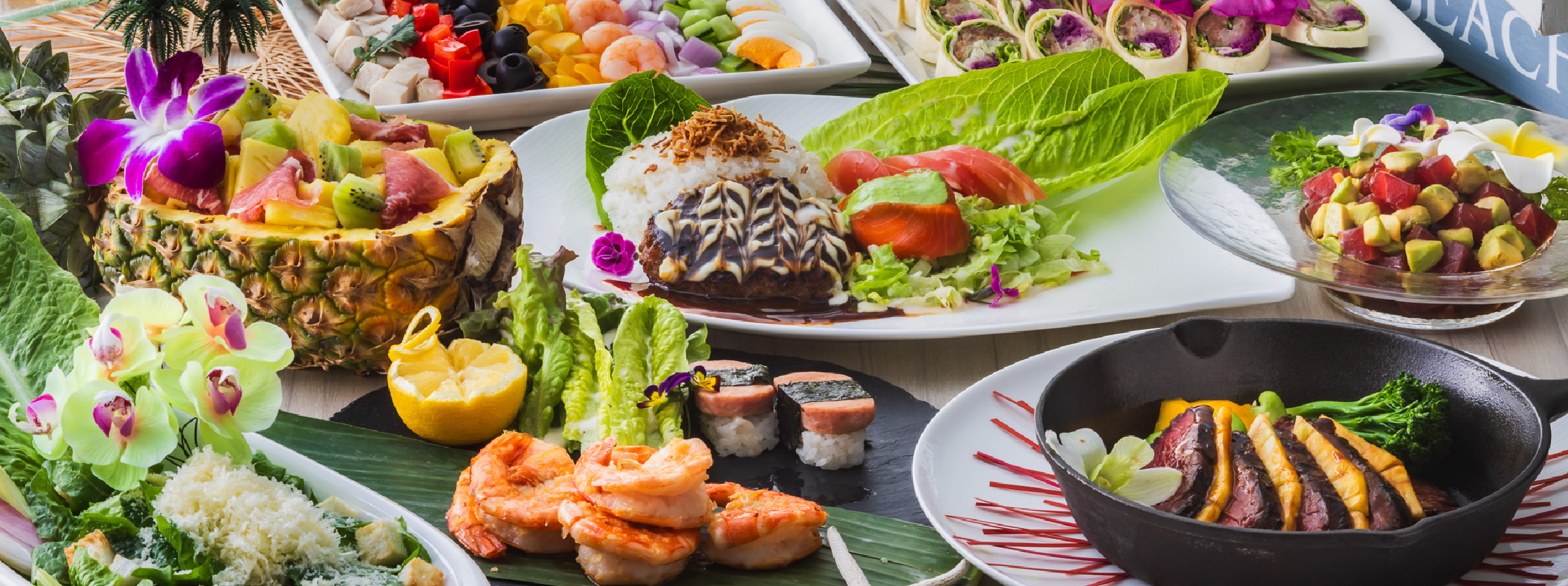 フルーツ盛り合わせ/アヒポキ/ロミロミサーモン/スパムマカロニサラダ/シーザーサラダ/ココナッツビーフカレーライス/ポークスペアリブ/モチコチキン/ガーリックシュリンプ