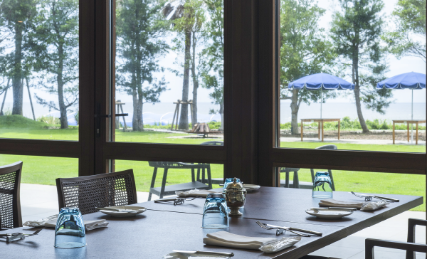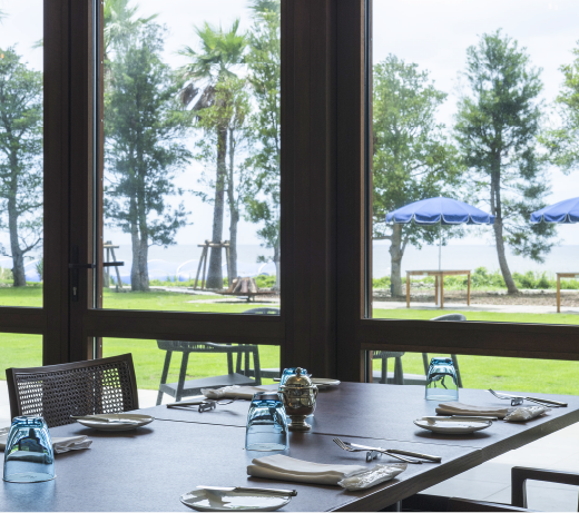 移りゆく時の流れを感じながら、ガーデンと海を臨む開放的なダイニング。