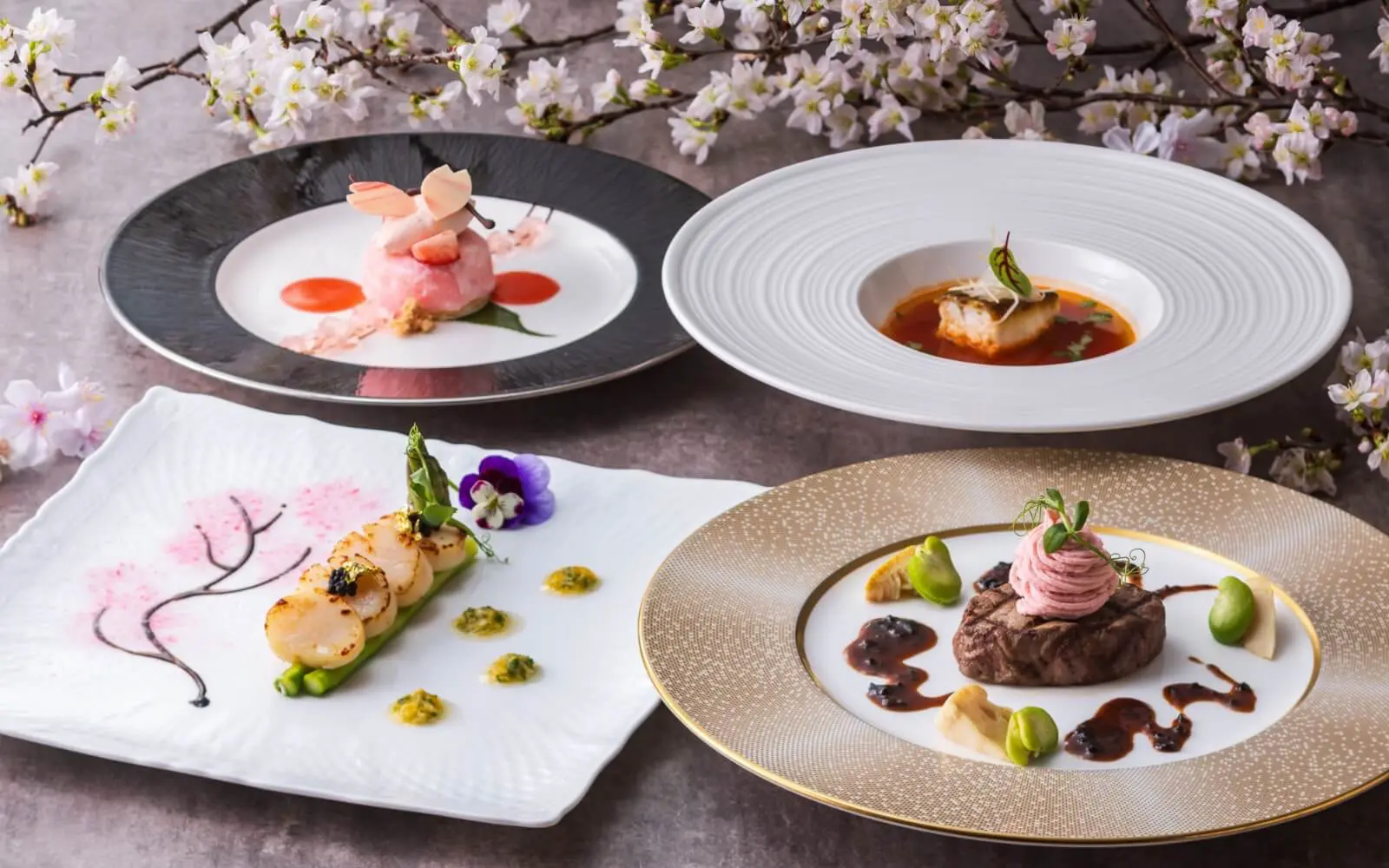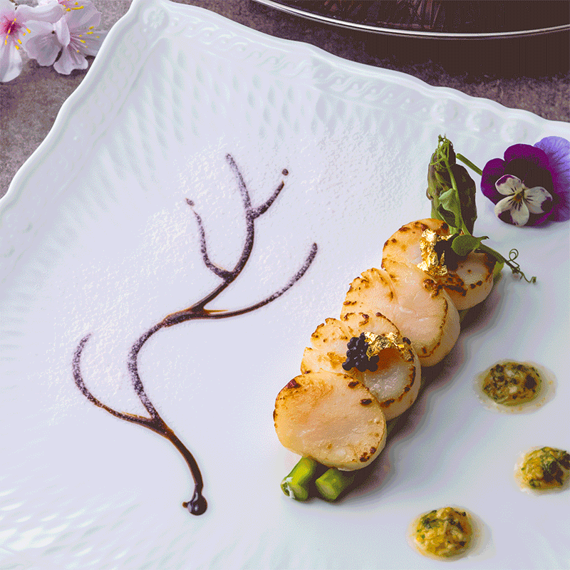 オードブルに描かれた桜の枝にさくらんぼリキュールのキルシュをひと吹きすると、ふわっと香るさくらんぼの香りと共に満開の桜が出現!目で見て香って味わって、五感で楽しめるランチコースです。