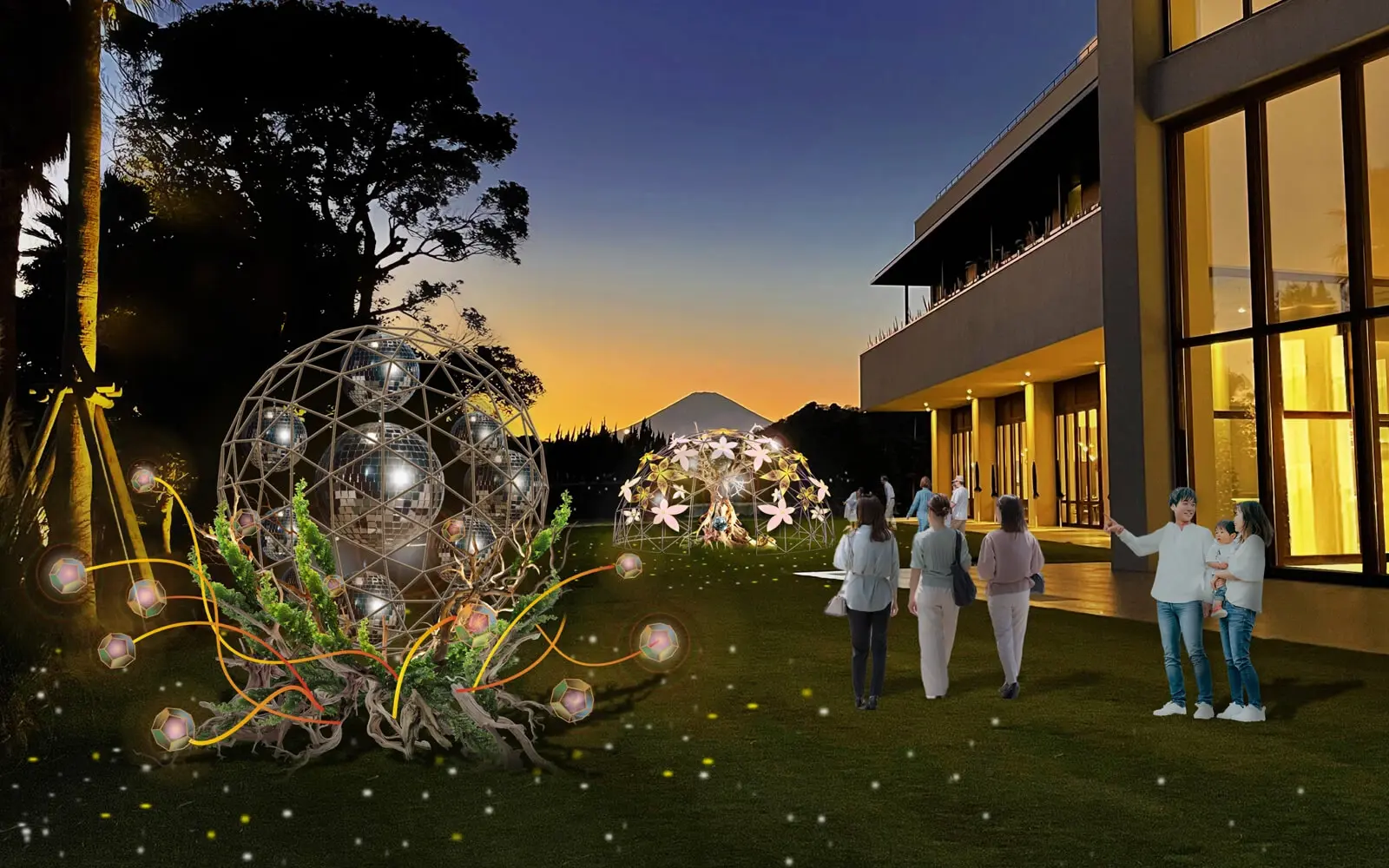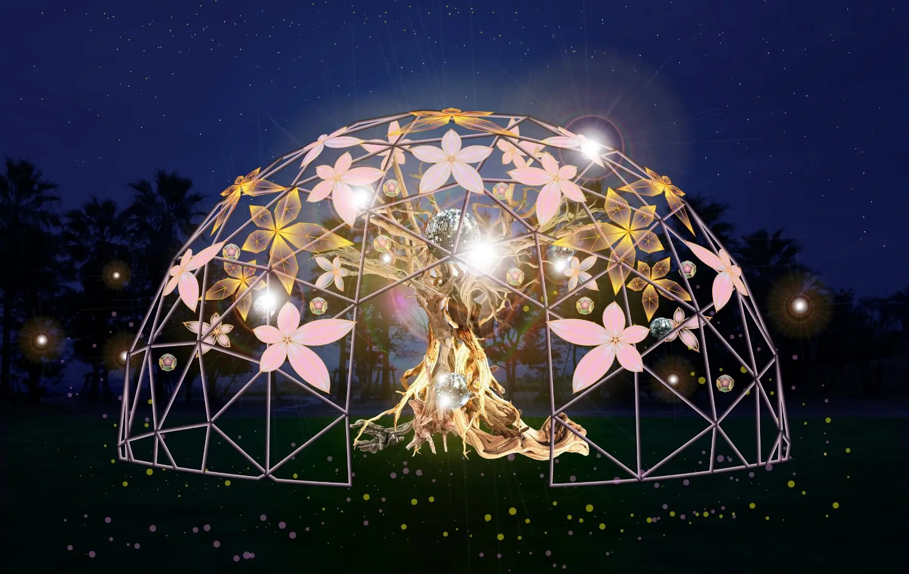 夜には幻想的なアートイルミネーションが美しく輝きます。