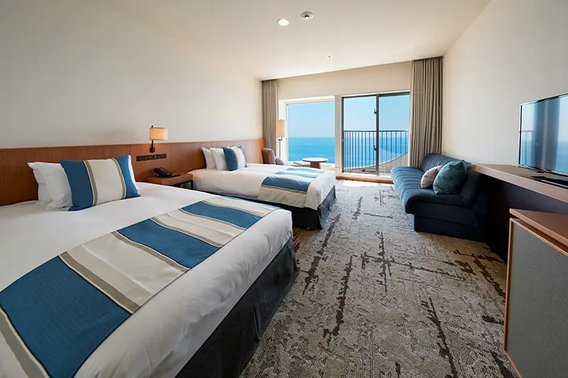 目の前に広がる水平線と一体になれるスパ「THERMAL SPA S.WAVE」。4Fスパフロア内の3ヵ所に芸術的な桜のアートが展開され、さらなる癒やしの空間を演出いたします。