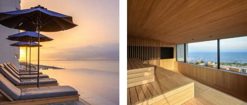 ⽔平線と⼀体になったような圧倒的な浮遊感を体験できるインフィニティプールをはじめ、温度帯の異なる4種のサウナ、アロマのシャワーなどをお楽しみいただけます。