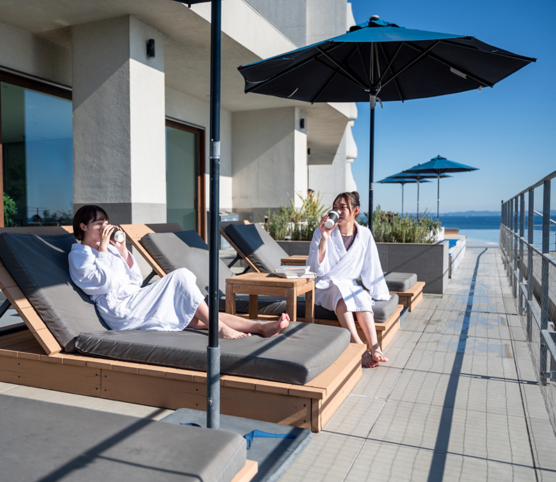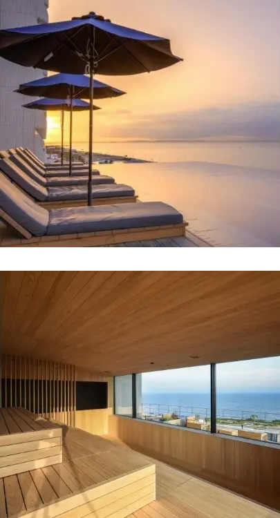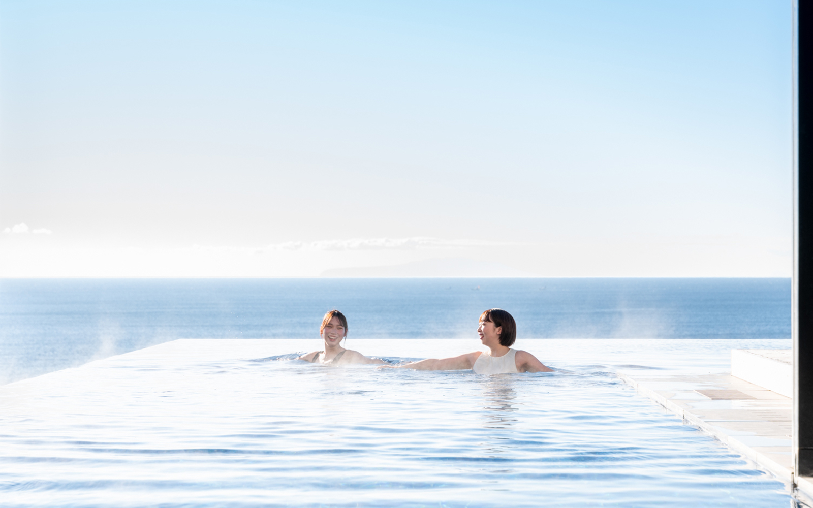 ⽔平線と⼀体になったような圧倒的な浮遊感を体験できる温水インフィニティプールをはじめ、 温度帯の異なる4種のサウナ、アロマのシャワーなどをお楽しみいただけます。