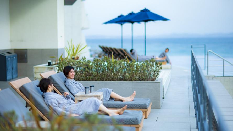 圧倒的な浮遊感を味わえるビュースポット。ドリンクを飲みながらもゆっくりとお過ごしいただけます。季節で水温を調節しているので、冬でも快適にご利用いただけます。営業時間などの詳細は以下リンク「THERMAL SPA S.WAVE」をご覧ください。 ※男女一緒にお楽しみいただけます。 ※水着着用エリアとなります。