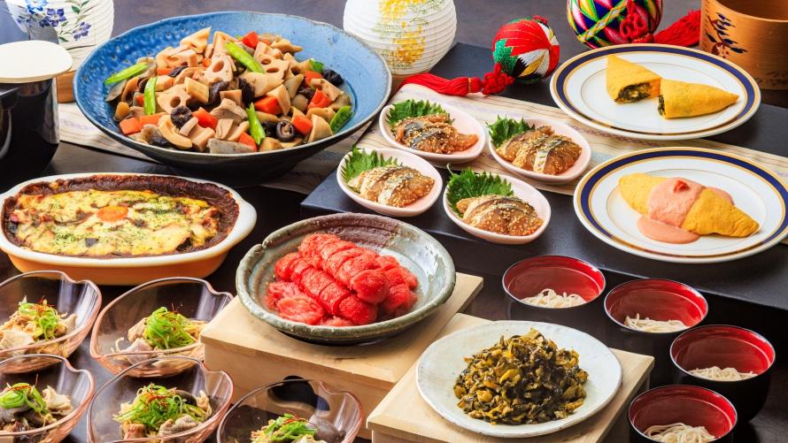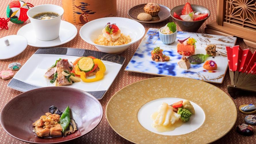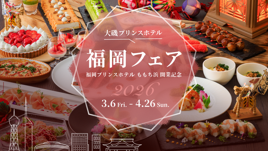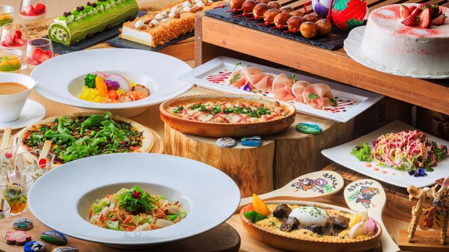 福岡の“よか味”を心ゆくまで楽しむ、春の“うまか・あまか”セミブッフェです。ブッフェボードには「福岡県郷土料理“おきゅうと”としらすの和え物」や「福岡県郷土料理“がめ煮”のグラタントマト風味」「博多なすと高菜のピッツァ」、デザートには「福岡・博多“タケシゲ醤油”のみたらし団子」「八女茶ロールケーキ」などが並びます。