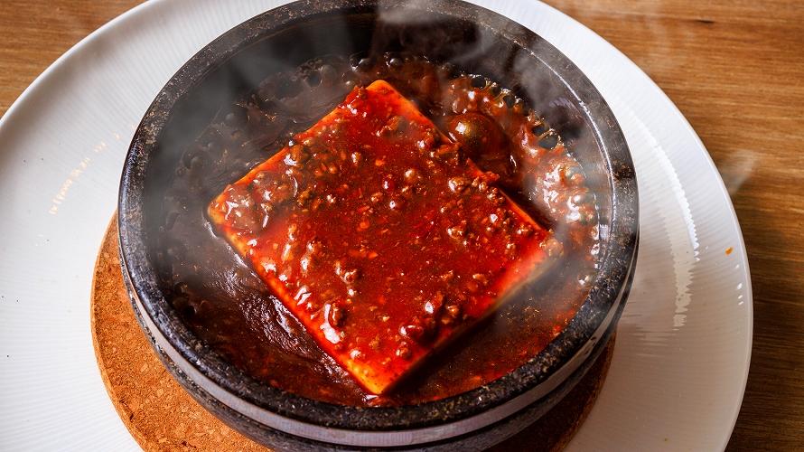 石鍋に入った大ぶりの豆腐に、麻婆あんをたっぷりかけました。お好みの大きさに豆腐をくずしながら、お召しあがりください。