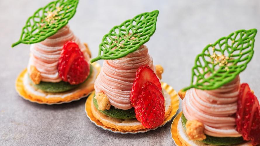 サブレと抹茶のフィナンシェの上に、カスタード、赤スグリのジュレ、イチゴをのせて、ほんのり桜が香る桜餡とマスカルポーネのクリームを絞った桜色のモンブランです。トップには桜の葉を思わせるチュイールを添えました。