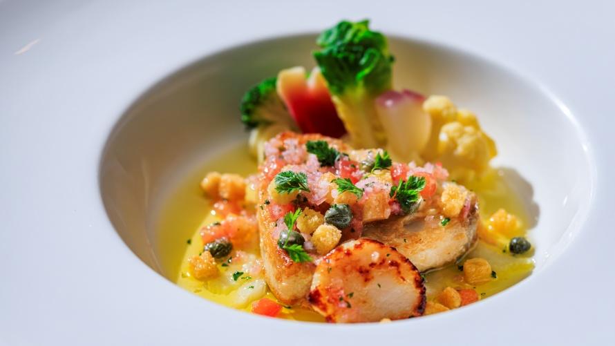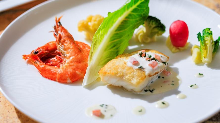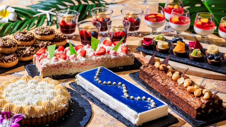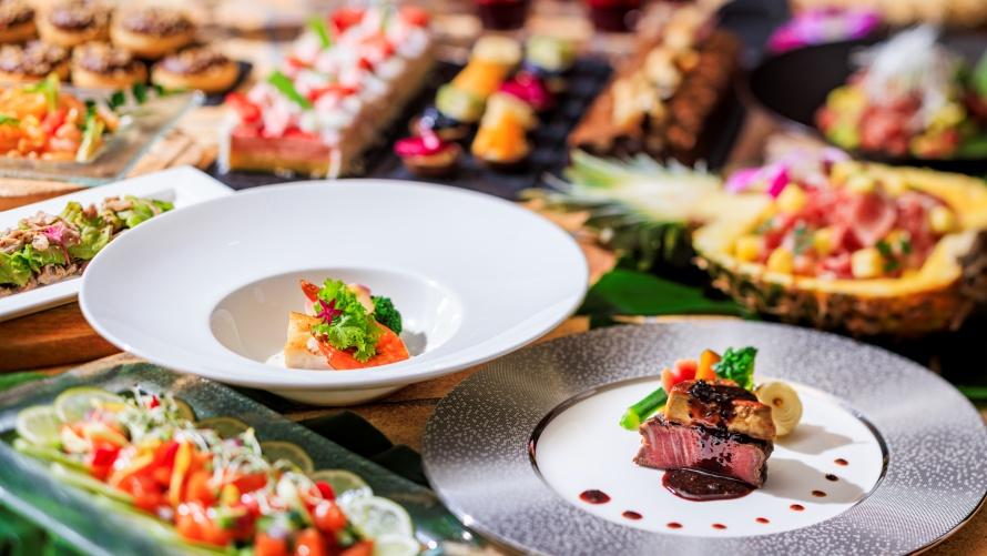 ハワイからインスピレーションを受けた「ハワイアンセミブッフェ」。オードブルには「ロミロミサーモン」や「アヒポキ」が並び、デザートには、ドラゴンフルーツやアサイー、ココナッツなど南国を思わせる食材を使用したスイーツが登場いたします。お好みのメインをお選びいただける「アクア」と、お魚とお肉のメインをお召しあがりいただける「ウェーブ」をご用意いたしました。開放的なダイニングで、南国リゾートにいるかのようなディナータイムをお過ごしください。