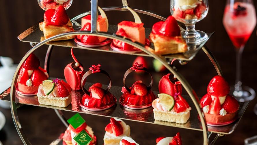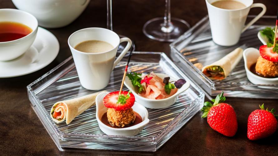 苺をふんだんに使用したストロベリーアフタヌーンティー。「いちごチーズテリーヌ」をはじめ、「いちごとピスタチオのスコーン」、「いちごパフェ」など、みずみずしい苺を味わえる色鮮やかな全10種のスイーツをご用意いたしました。セイボリーは「牛挽肉のクロケット マデラソース」、「茸のクリームスープ」など全4種のメニューをお楽しみいただけます。