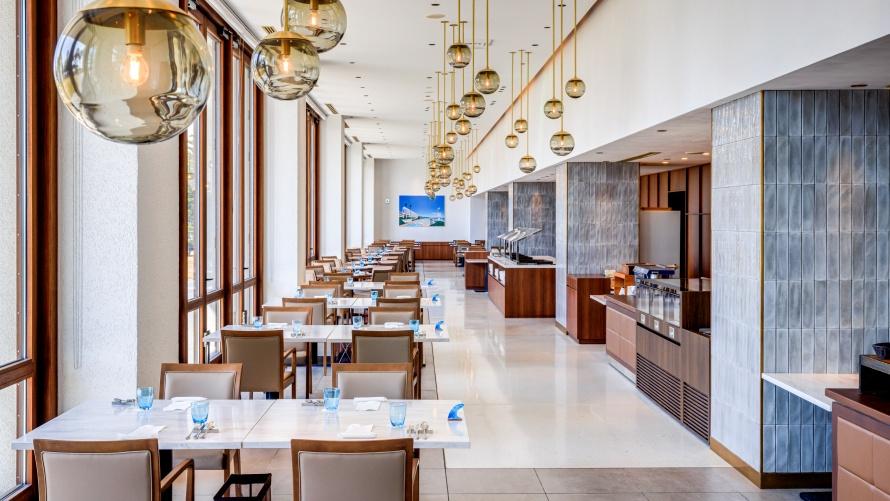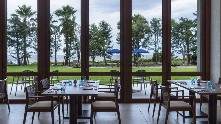 大きな窓の向こうにはガーデンと太平洋を臨む開放的なダイニング