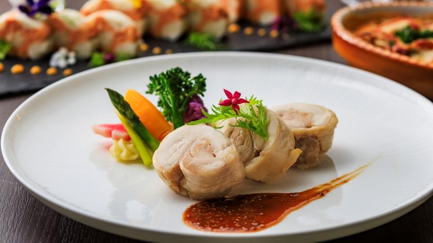 前菜には「はかた地どりの蒸し鶏 柚子胡椒風味」や「博多名物 酢モツ」などを、メイン料理には、福岡で江戸時代から300年以上愛されている調味料“庄分酢”を使用した「牛サーロイン肉のグリル 福岡県産庄分酢のもろみ味噌ソース」など、福岡の食文化をより豊かに味わうラインアップでご用意いたしました。魚料理と肉料理のどちらも楽しめるコースや、ワンプレートで味わうシェフズディナーなど、その日の気分やシーンに合わせて選べるのも魅力です。