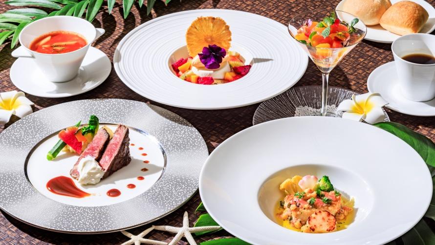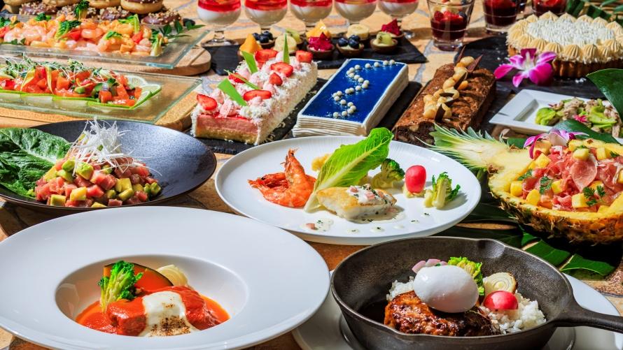 オードブルには「カルーアポーク」や「ロミロミサーモン」などのハワイならではの料理が並び、お好みのメイン料理をお選びいただけるセミブッフェ。開放的なダイニングで、ハワイ気分をお楽しみください。