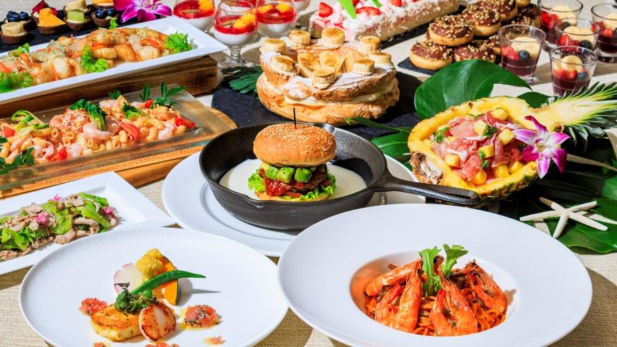 ハワイからインスピレーションを受けた「ハワイアンセミブッフェ」。オードブルには「ロミロミサーモン」や「アヒポキ」が並び、デザートには、ドラゴンフルーツやアサイー、ココナッツなど南国を思わせる食材を使用したスイーツが登場いたします。お好みのメインをお選びいただける「アクア」と、お魚とお肉のメインをお召しあがりいただける「ウェーブ」をご用意いたしました。開放的なダイニングで、南国リゾートにいるかのようなディナータイムをお過ごしください。