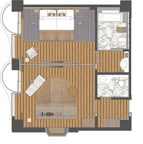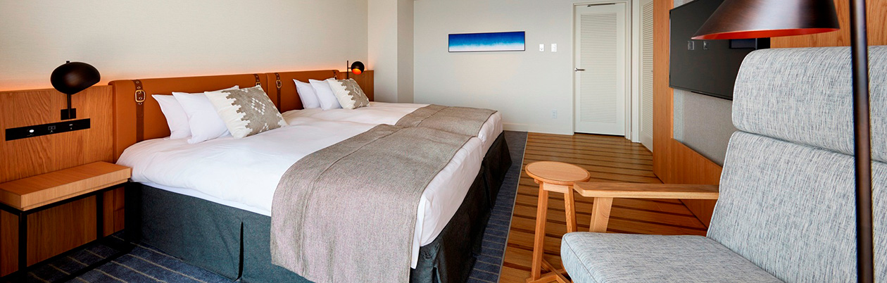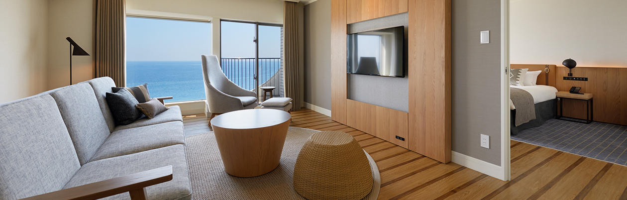 最大4名さまでご利用いただける、開放感あふれる角部屋。水平線から昇る朝日や、晴れた日には遠く江の島まで望む絶景をお楽しみいただけます。
