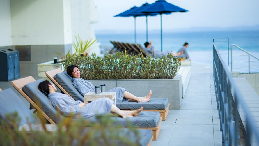 スパ棟の3-4F「THERMAL SPA S.WAVE」では、水平線と一体となり圧倒的な浮遊感を感じるインフィニティプールを楽しんだり、テラスで寛いだり、4種のサウナや岩盤浴をお楽しみいただけます。詳しくは以下リンクをご覧ください。