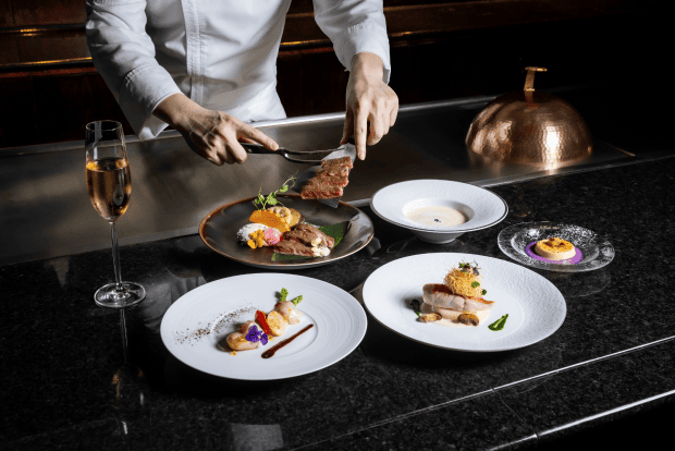 選び抜いたお肉やお野菜を、目の前で焼きあがる音、そして香りとともに竹林を望む和の空間の中で優雅にディナーを堪能。