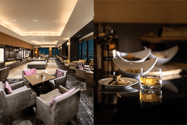 ホテル最上階のクラブラウンジで、大阪湾にそそぐ川、北摂・神戸の山々、大阪中心地のビル群といった非日常が広がる夜景を堪能。グラスを傾けながら就寝前のリラックスタイムを。