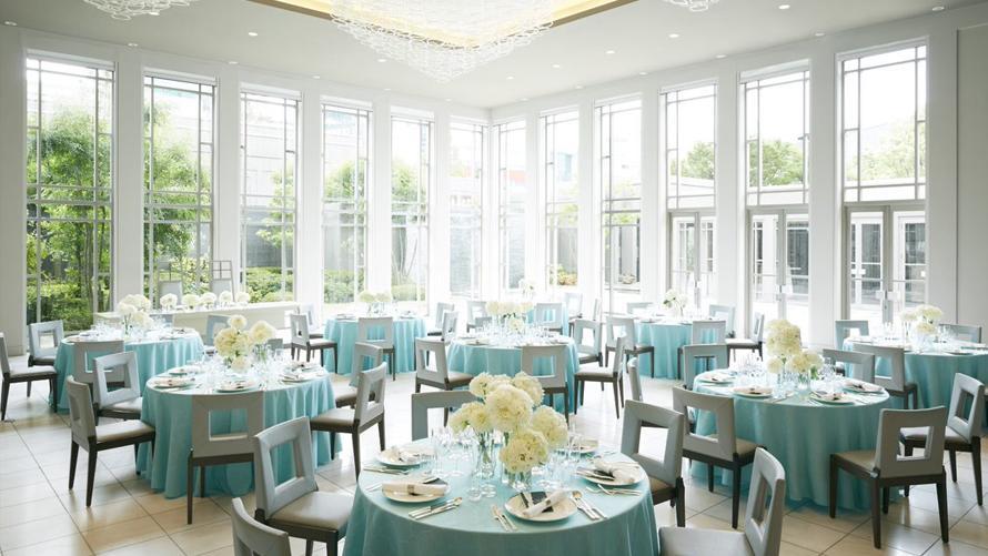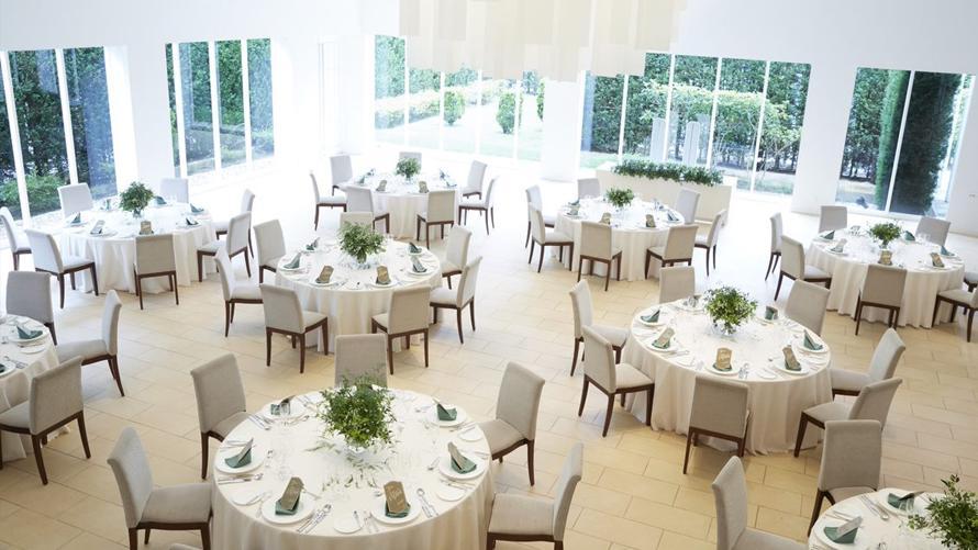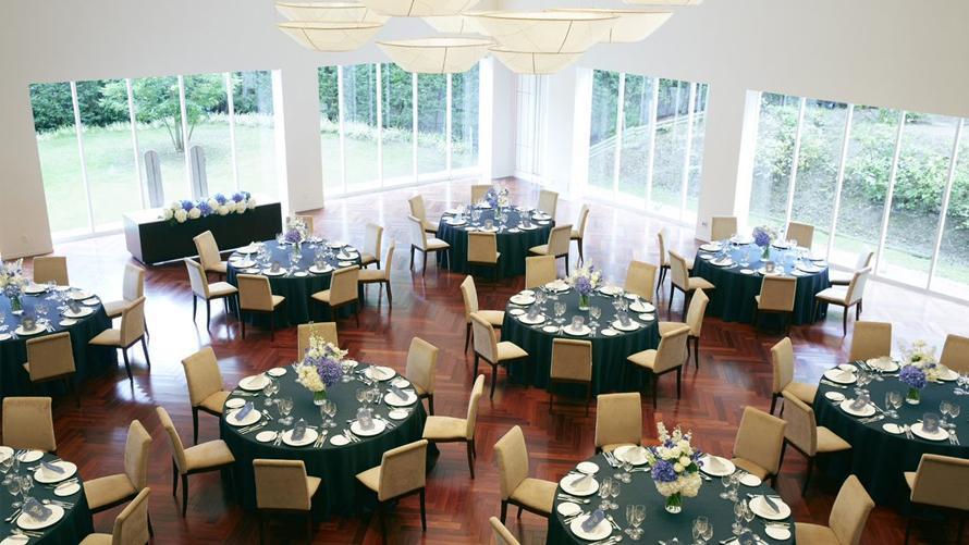 光・緑・水の自然を感じる清らかな雰囲気の中、併設されたショーキッチンでの演出や会場の壁面を使用した映像演出など多彩な演出が可能です。