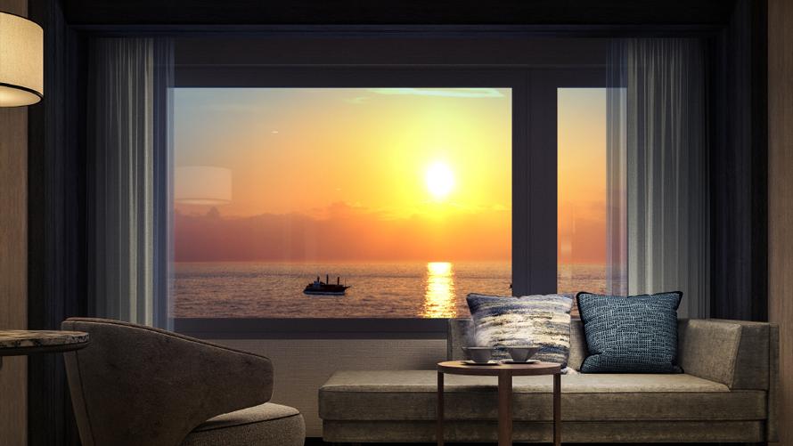 客室のソファベッドや、スイートルームの寝室のソファを窓際に配することで、この場所だからこその絶景を臨み、寛ぎが得られるステイに。