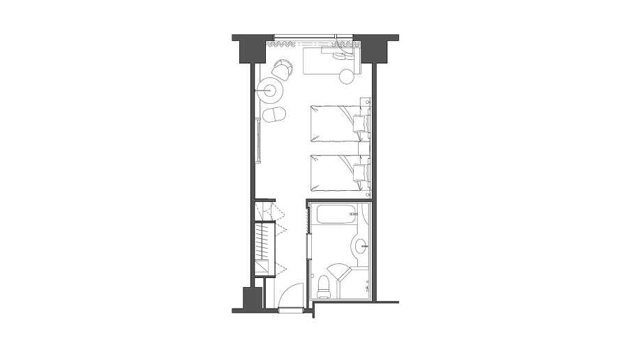 28階クラブラウンジのご利用特典が含まれた客室。40㎡の客室はツインベッドを配し、窓際のソファーではゆったりとくつろいでいただける客室。