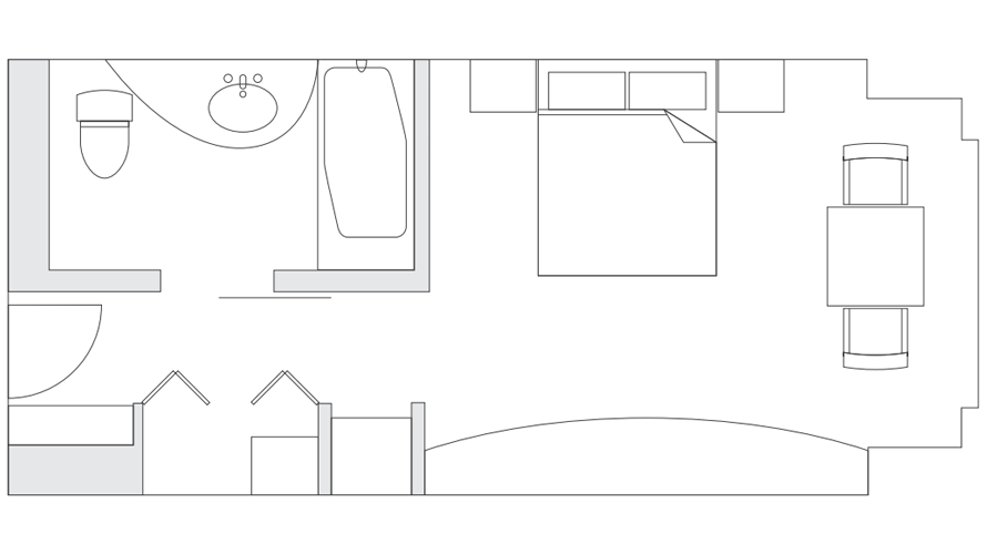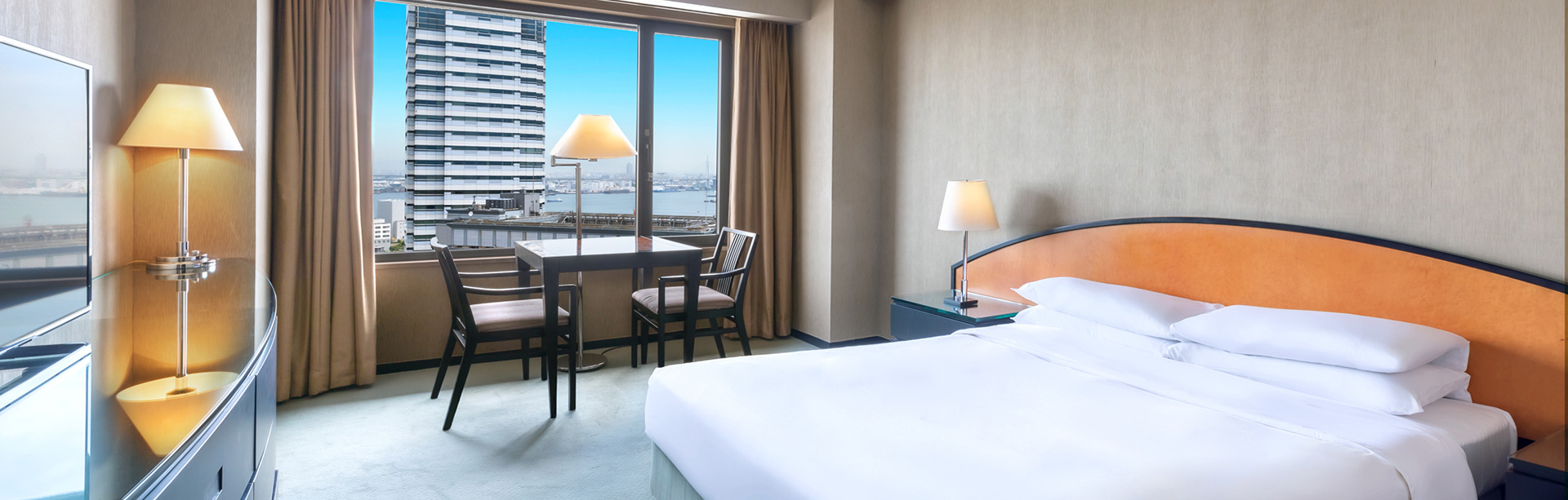 モダンジャパニーズをコンセプトにデザインされた室内に、クインサイズベッドを配した30㎡の高層階客室です。