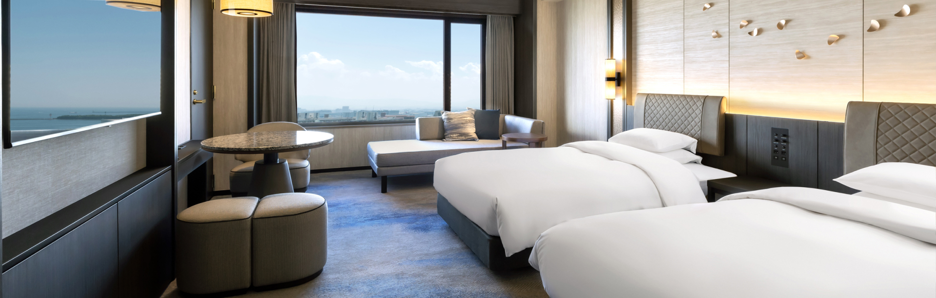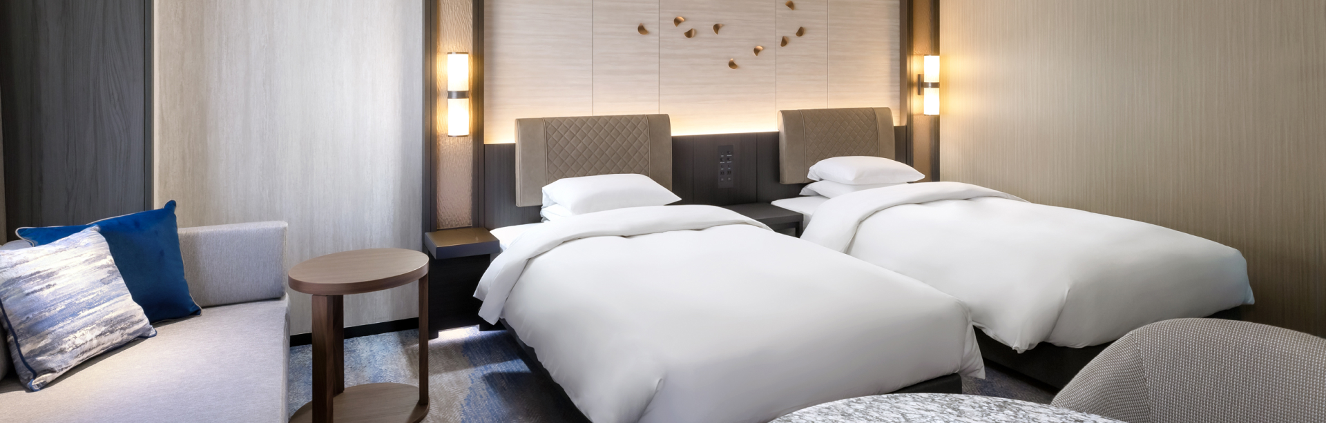 40平米の客室にはツインベッドを配し、品格と優雅さを併せ持つ「Authentic and Sophisticated」をコンセプトにデザインされた室内