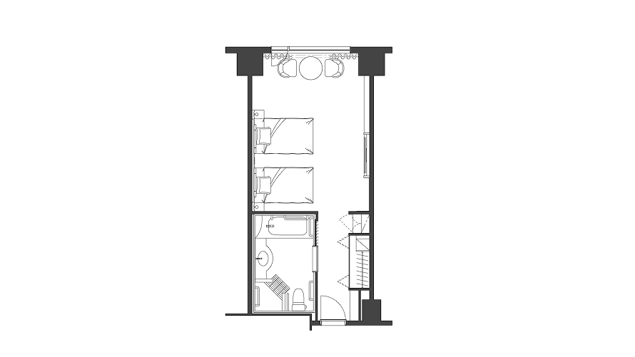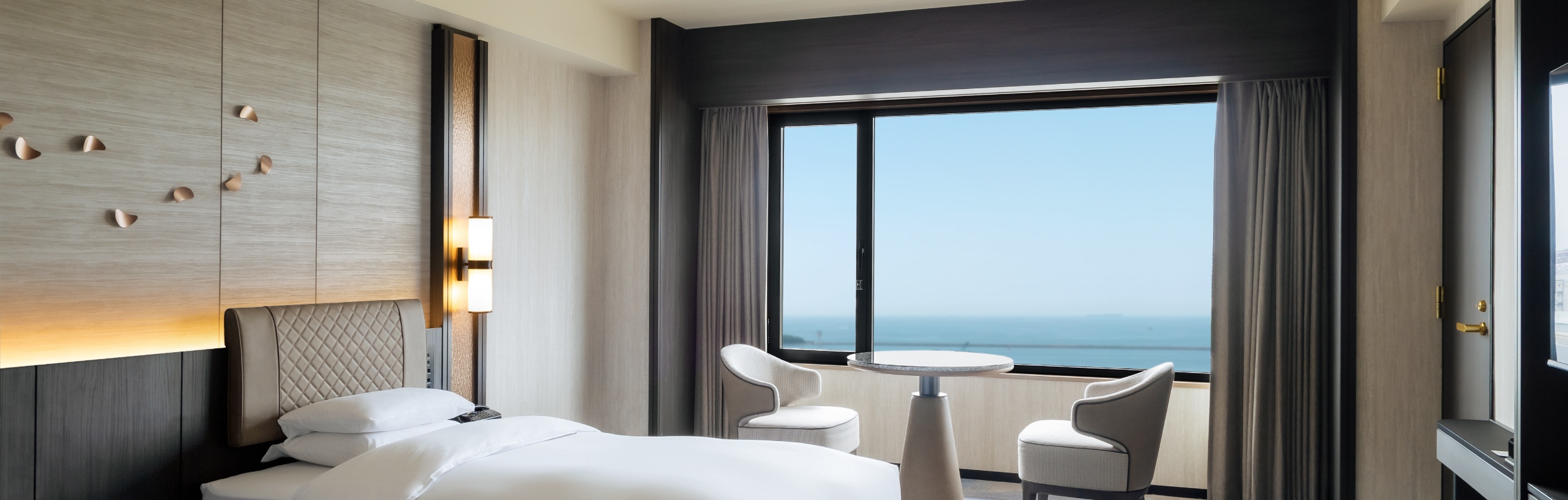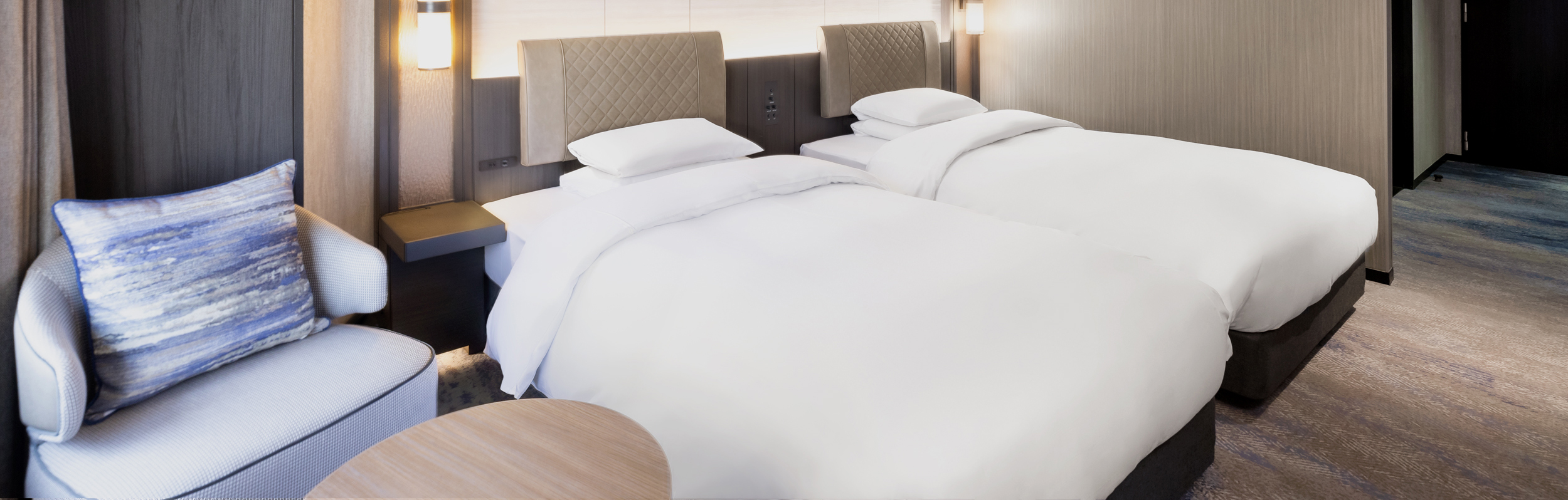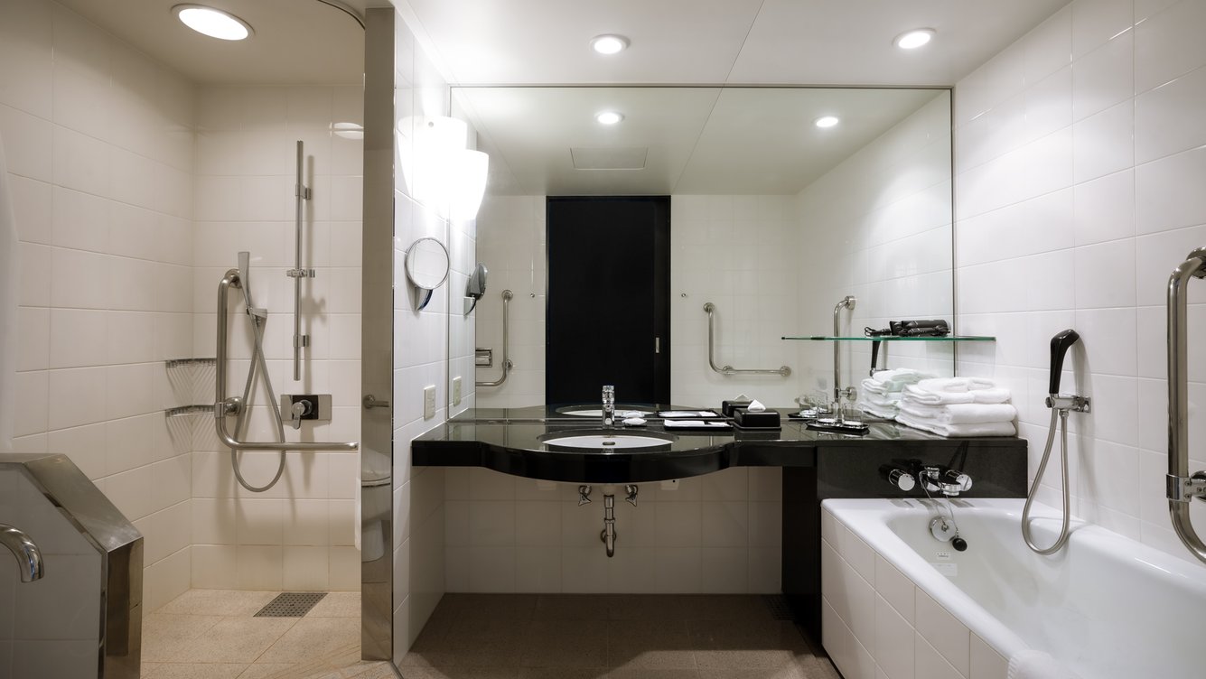 40平米の客室にはツインベッドを配し、品格と優雅さを併せ持つ「Authentic and Sophisticated」をコンセプトにデザインされた室内。テーブルと椅子のセットを窓側に配し、ベッド周辺のスペースを大きく取った家具の配置は、車いすの方でもゆとりをもって移動いただけます。また、バスルームのシャワーブースは、ガラスではなくカーテンを仕切りとしており、スロープを利用して車いすのままシャワーブースに入ることが可能です。